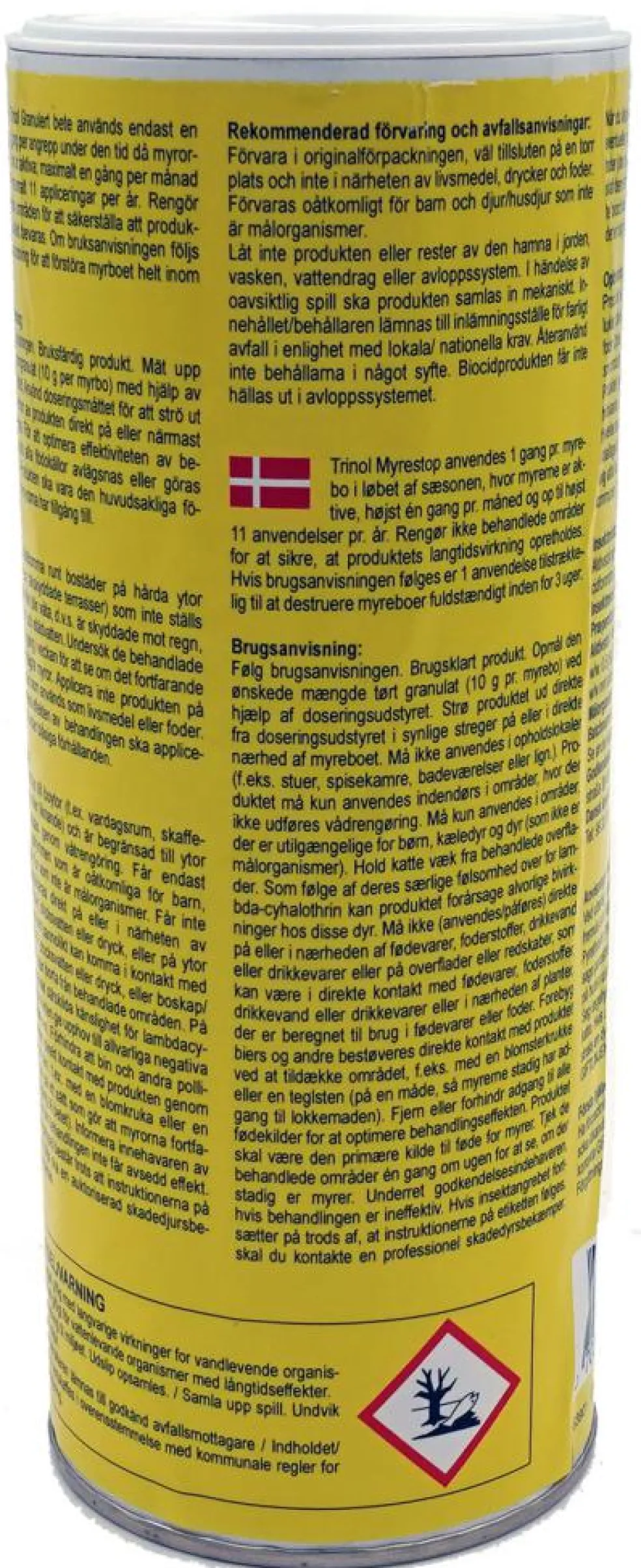 Trinol Myrestop er specielt designet til effektivt at bekæmpe Sort havemyre (Lasius Niger) indendørs. Produktet kan nemt strøs ud i områder, hvor myrerne er mest aktive, og sikrer en hurtig og langvarig effekt.