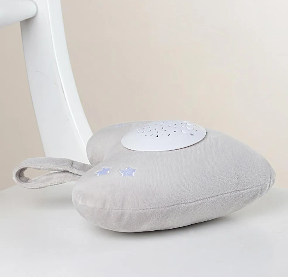 Natlampen projekterer en farvet stjernehimmel op i loftet og skaber blidt lys i rummet. Den bløde natlampe kan afspille 10 melodier, hjerteslag og fugleseng – alle hjælper til at beroligebarnet til en tryg nattesøvn.