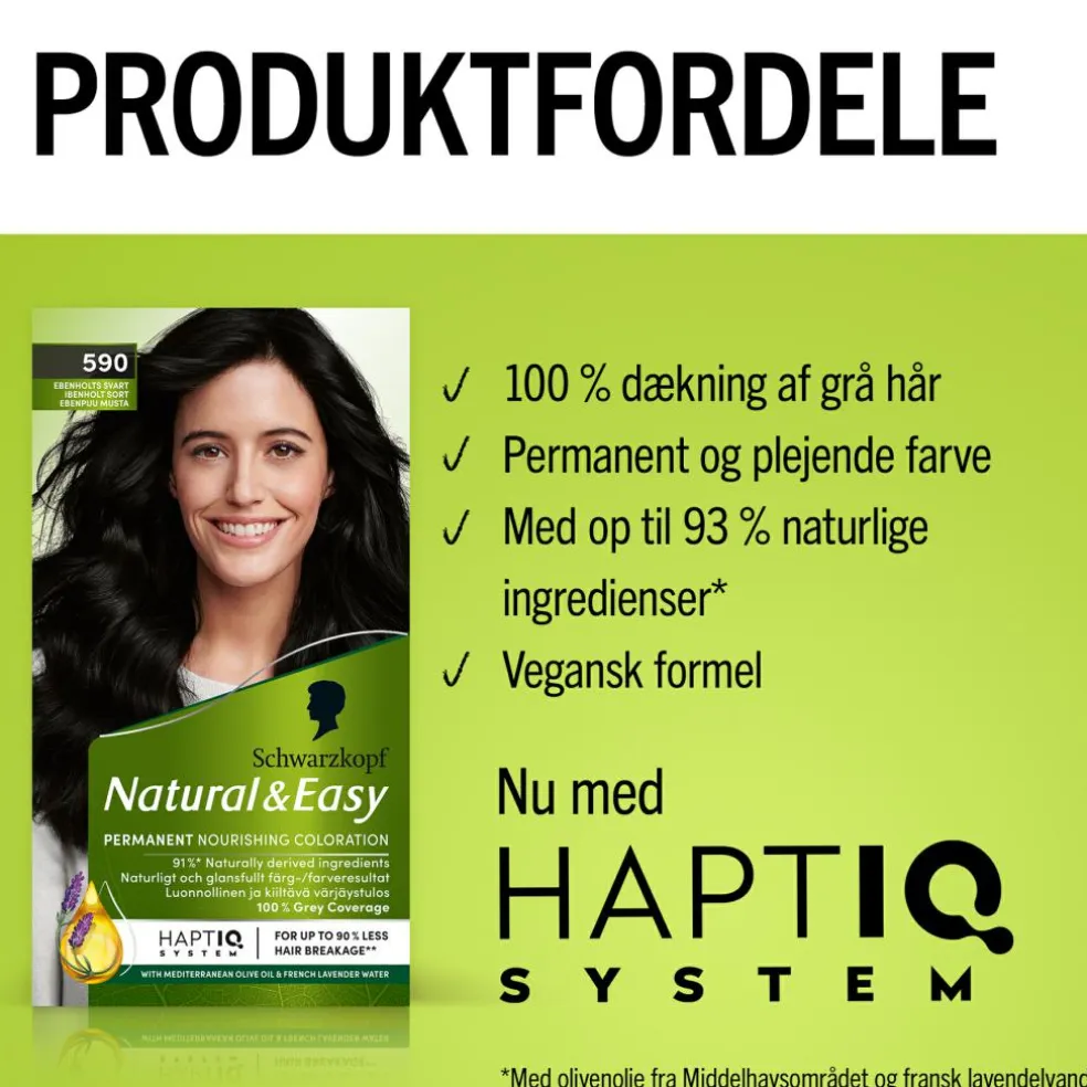 Hårfarven giver 100% dækning af grå hår, så de er nemme at dække. Hårfarven er også vegansk og fri for animaliske ingredienser, med op til 93%* ingredienser af naturlig oprindelse, der fremhæver en naturlig hårfarve. Vil du også have en plejende hårfarve? Den medfølgende balsam med olivenolie fra Middelhavet indeholder 97%* ingredienser af naturlig oprindelse, hvilket giver dig et smukt og skinnende hår.