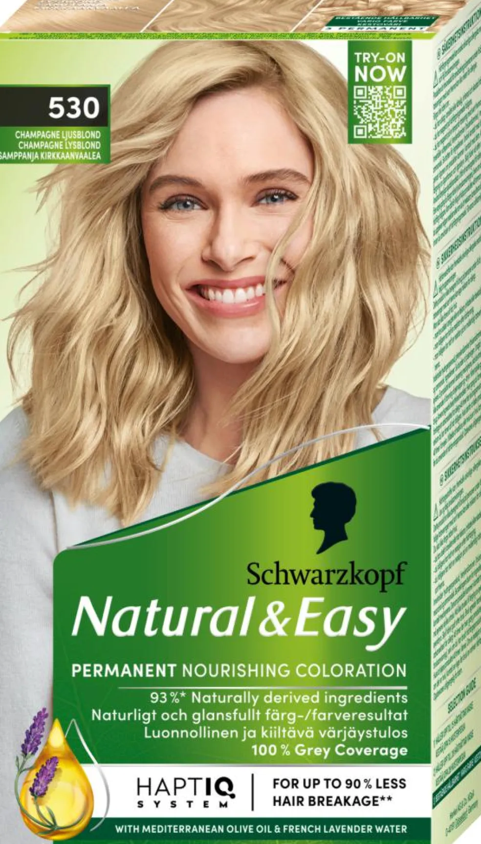 “Hårfarve fra Schwarzkopf – Natural & Easy 530 Champagne Lysblond er en permanent blond hårfarve, specielt udviklet til dig, der ønsker at farve håret hjemme og få en naturlig blond hårfarve. Den plejende formel med fransk lavendelvand indeholder 3 færdigblandede nuancer, hvilket giver dig et smukt og naturligt farve resultat.Hårfarven giver 100% dækning af grå hår, så de er nemme at dække. Hårfarven er også vegansk og fri for animaliske ingredienser, med op til 93%* ingredienser af naturlig oprindelse, der fremhæver en naturlig hårfarve. Vil du også have en plejende hårfarve? Den medfølgende balsam med olivenolie fra Middelhavet indeholder 97%* ingredienser af naturlig oprindelse, hvilket giver dig et smukt og skinnende hår.Sådan bruger du hårfarven fra Natural & Easy:1. Tryk indholdet fra farvetuben ind i flasken med udviklingsemulsion og ryst derefter ordentligt!2. Påfør derefter farveblandingen direkte fra applikationsflasken på tørt, ikke vasket hår og lad det virke i 30 minutter.3. Skyl grundigt og brug derefter den medfølgende plejende balsam og afslut med at skylle ud igen.Tip: Hvis du har langt, tykt eller krøllet hår eller hvis du farver for første gang, anbefales det at bruge to pakker ved farvning. For et mere langvarigt farveresultat kan du kombinere med GLISS Colour Perfector-serien, der reparerer og beskytter farvet hår.Formlen indeholder også et HaptIQ System, der er baseret på molekylær hårvidenskab og plejer dit hår ved at:1. Skabe nye mikrobindinger inde i hårstråene.2. Efterlade en plejende beskyttelse af håret efter farvning.3. Gendanne hårets styrke med op til 90% mindre hårtab**, alt for et langvarigt farveresultat.*Inklusiv vand, **Test med måleinstrument med og uden Care Conditioner.”