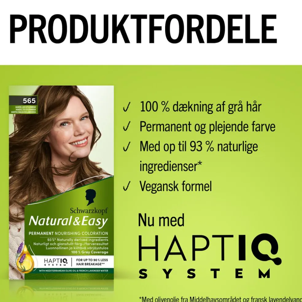 Hårfarven giver 100% dækning af grå hår, så de er nemme at dække. Hårfarven er også vegansk og fri for animaliske ingredienser, med op til 93%* ingredienser af naturlig oprindelse, der fremhæver en naturlig hårfarve. Vil du også have en plejende hårfarve? Den medfølgende balsam med olivenolie fra Middelhavet indeholder 97%* ingredienser af naturlig oprindelse, hvilket giver dig et smukt og skinnende hår.