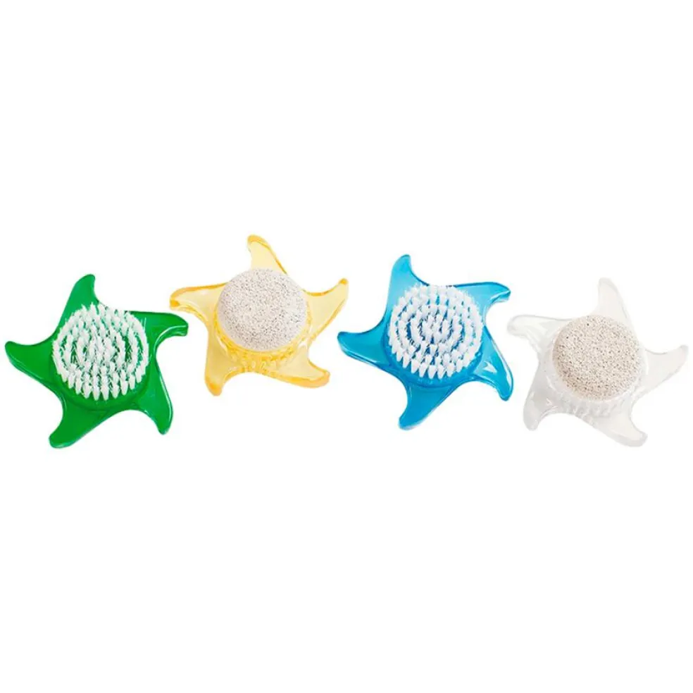 Neglebørste med pimpsten fra Croll & Denecke. Neglebørsten er formet som en søstjerne og kommer i flotte, assorterede farver. På den ene side af søstjernen er der børstehår til at rense under dine negle, imens der på den anden side er en pimpsten, som er rigtig god til at eksfoliere tør hud.