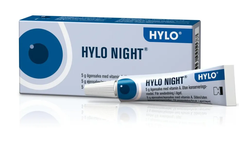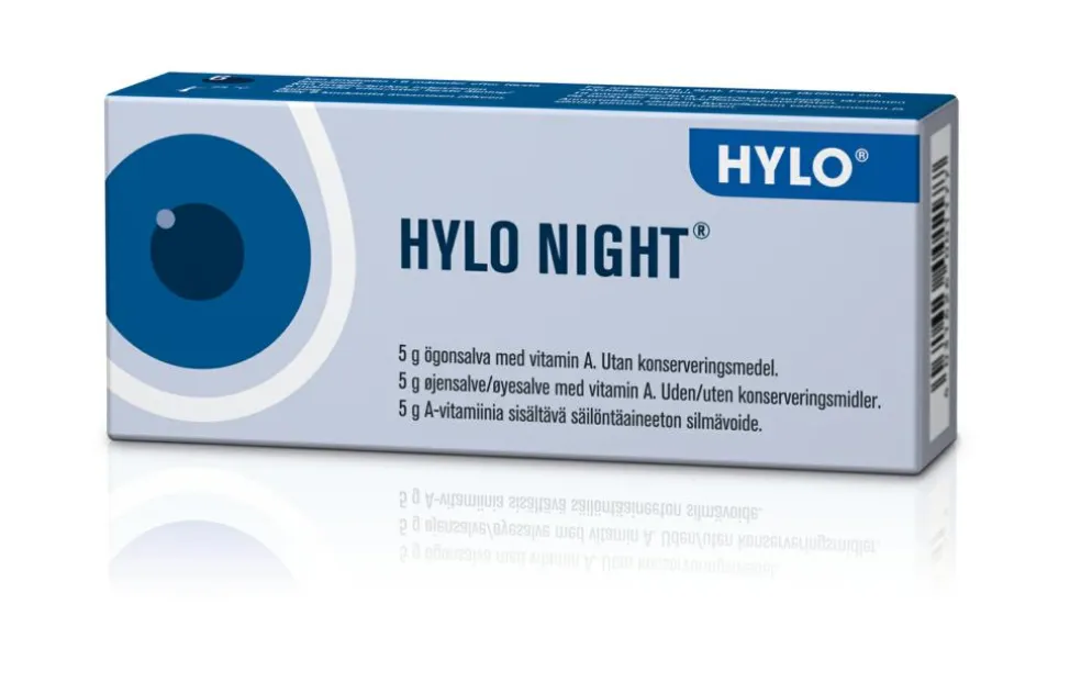 HYLO NIGHT forbedrer tårefilmen og beskytter øjets overflade. HYLO NIGHT er en særlig blød og glat øjensalve, der fordeler sig rigtig godt på øjets overflade. Ingrediensen A-vitamin, som også findes naturligt i tårevæsken, gør salven veltolereret og sikrer, at salven blandes med den naturlige tårevæske. Dette lindrer ubehaget ved stikkende/brændende fornemmelse, tørre, trætte eller vandige øjne, hvilket er almindeligt ved lipidmangel i tårefilmen.