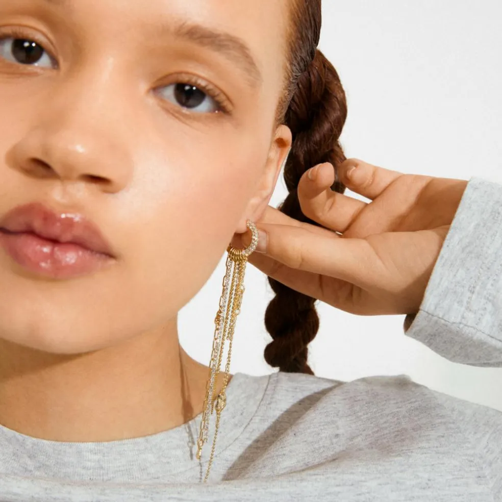De guldbelagte DRUE-øreringe fra Pilgrim er det ultimative go-to, når du vil tilføre dit look et hint af effortless luxury. De små hoops med Preciosa-krystaller smelter sammen med en kaskade af kæder og fine vedhæng, der skaber et legende, free-minded udtryk med en breezy feel.
