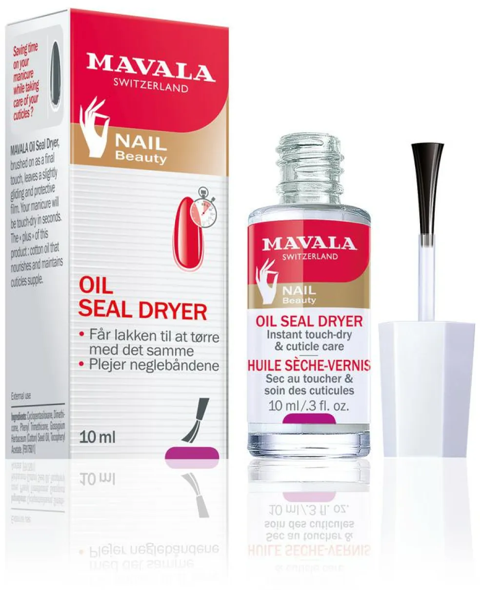 Tørrer neglelakken hurtigt og plejer dine neglebånd. Mavala Oil Seal Dryer speeder neglelakkens tørretid op. Perfekt til tør hud og tørre neglebånd, da den er beriget med bomuldsolie, som blødgør og regenererer huden samt antioksidativ E-vitamin. Den danner en let ikke-klæbrig film, som omgående forsegler farven og beskytter neglelakken mod fingeraftryk, pudemærker og lette skrammer eller stød. Anvendelse: Efter at du har lagt neglelak og Colorfix Overlak venter du nogle få sekunder. Så lægger du med hurtige børstestrøg Oil Seal Hurtigtørrende Overlak på hele neglens overflade og en smule ud over neglens kontur. Sørg for at holde børsten fladt uden at lægge for meget tryk på. Vent ca. 10 sekunder mens du lader overlakken virke.