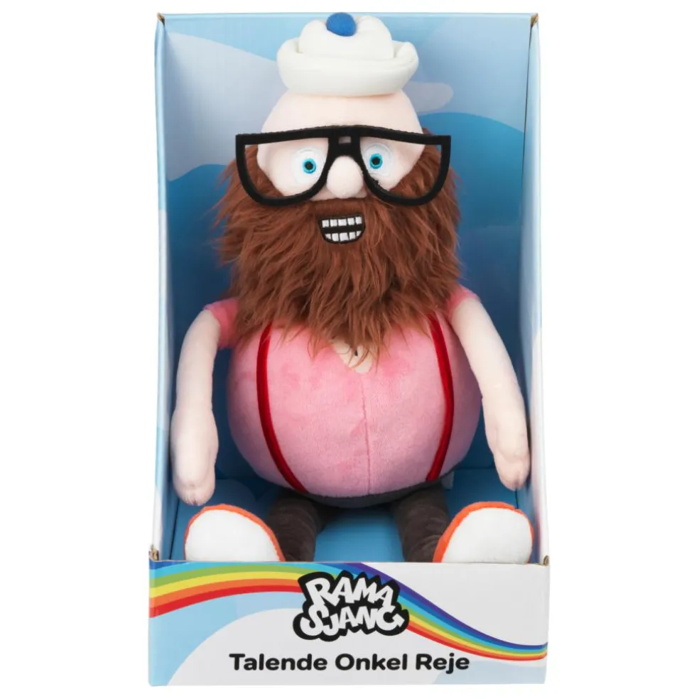 Nu kan børnene tage med Onkel Reje på eventyr med denne Onkel Reje Plys på 28 cm, der kan afspille en masse, sjove, frække og skøre sætninger i samme stil, som børnene kender ham fra Ramasjang.