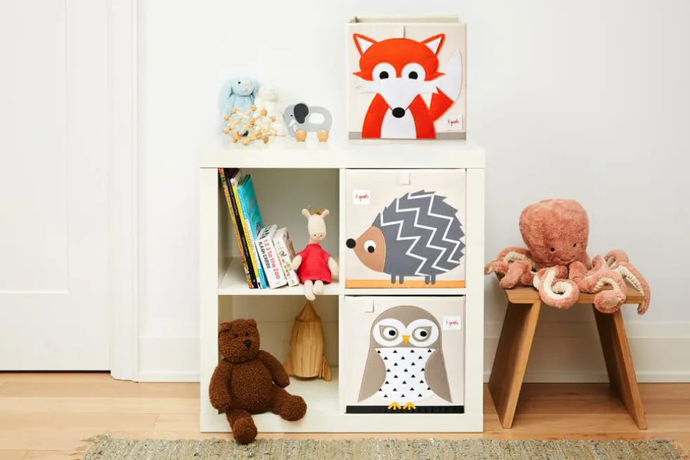 3 Sprouts opbevaringskassen passer ind i almindelige reolsystemer og er en praktisk og effektiv måde at sortere og gemme legetøj i.