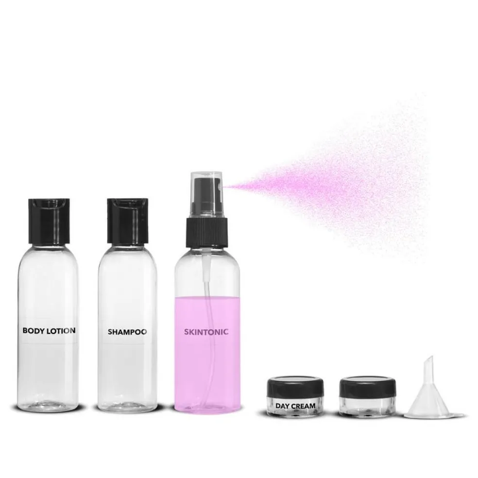 2 krukker til f.eks. creme, 3 flasker, hvor af den ene er med spray. Derudover en lille tragt som gør påfyldning nemmere.