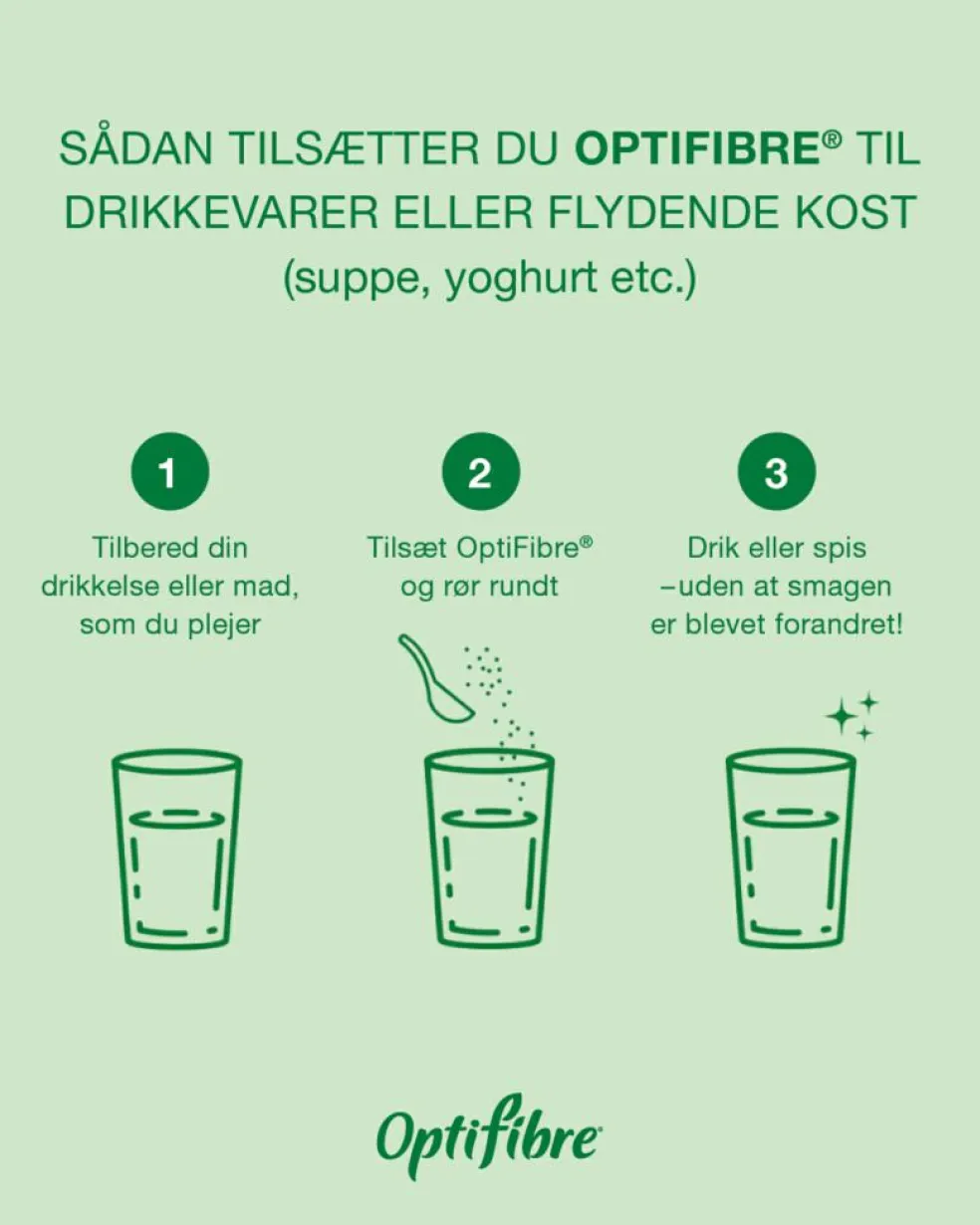 OptiFibre® er letopløselig, lugtfri og har en neutral smag. Pulveret kan røres ud i alle ikke kulsyreholdige væsker (vand, kaffe, frugtjuice etc.) eller i flydende kost (yoghurt, suppe etc.), varme eller kolde.