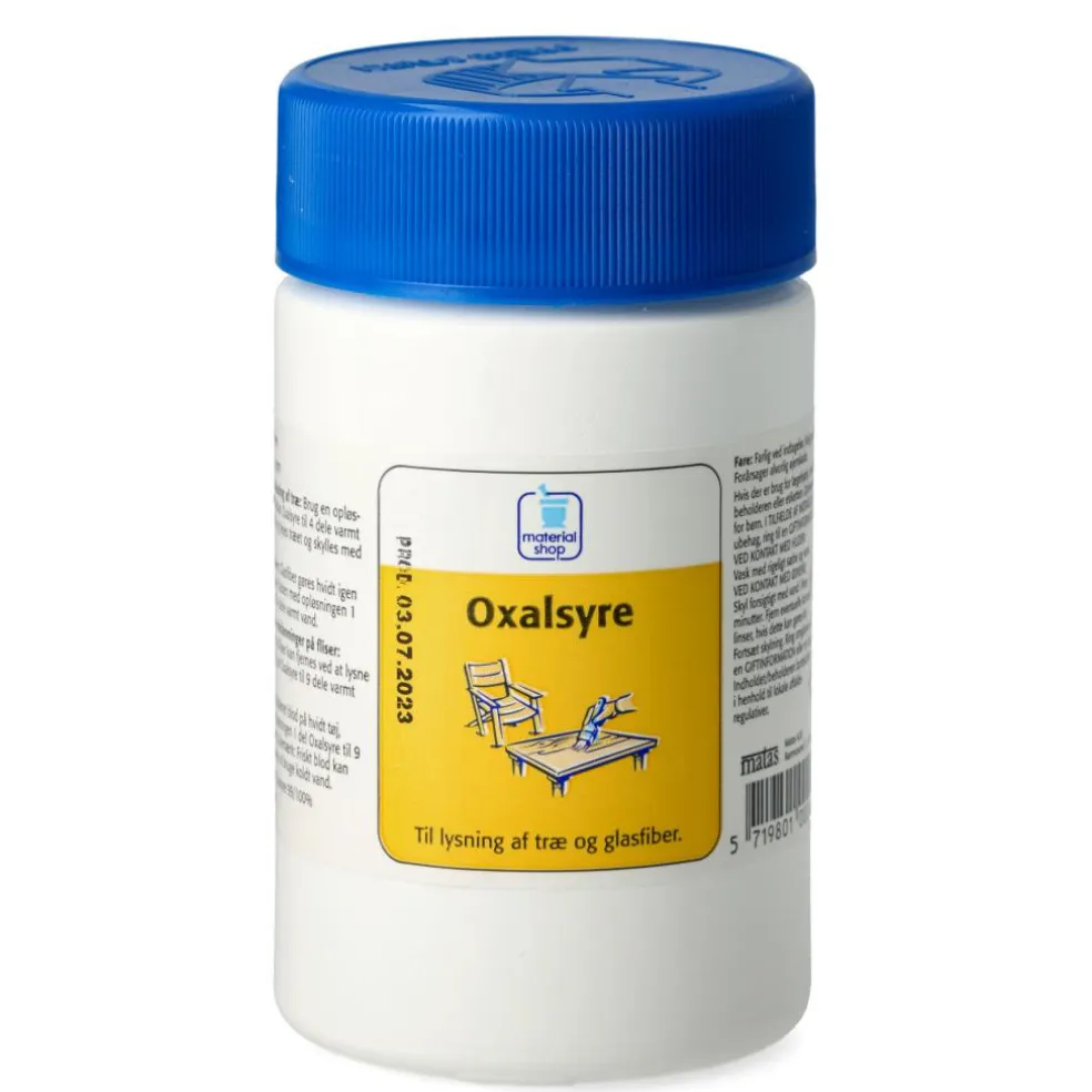 Perfekt til lysning af råt træ: Påfør en opløsning af 1 del Oxalsyre til 4 dele varmt vand med en svamp eller en børste og lad det tørre. Børst træet og vask med koldt vand.
