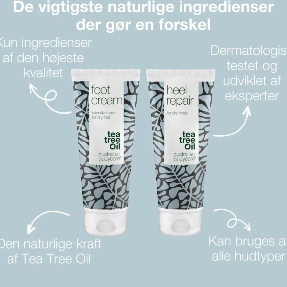Både fodcremen og hælcremen er baseret på bakteriemodvirkende Tea Tree Oil samt blødgørende Urea/Carbamid, som tilfører og binder væsken i huden, så huden gennemfugtes og opnår sin rette fugtbalance.