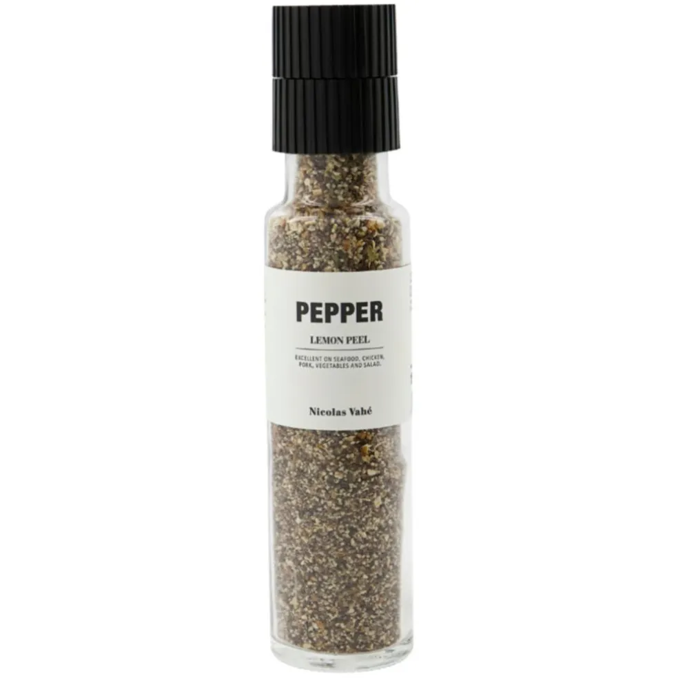 Denne sorte peberblanding med citron passer perfekt til retter med fisk og skaldyr. Nyd den sorte pebers karakteristiske smag med det klassiske Nicolas Vahé tvist i form af en afstemt smag af citron. Smagen passer rigtig godt sammen med blandt andet kylling, gris og diverse hjemmelavede salater, der lige trænger til et ekstra pift.