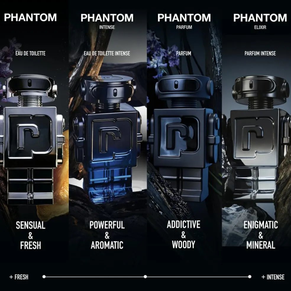 En intens, aromatisk træagtig duft, der fanger nattens mystik og magnetisme. PHANTOM Parfum kombinerer elektrisk lavendel, vanedannende vanilje og sensuel vetiver i en mørk, sensuel og træagtig duftsti præget af amber.