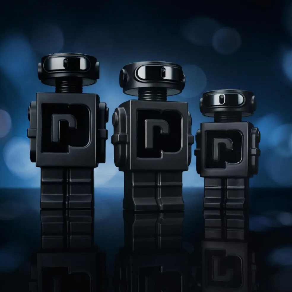 PHANTOM Parfum er et mesterværk i raffineret design. Flakonen er skulptureret i mat sort med rene, grafiske linjer, der fanger nattens energi og mystiske elegance.
