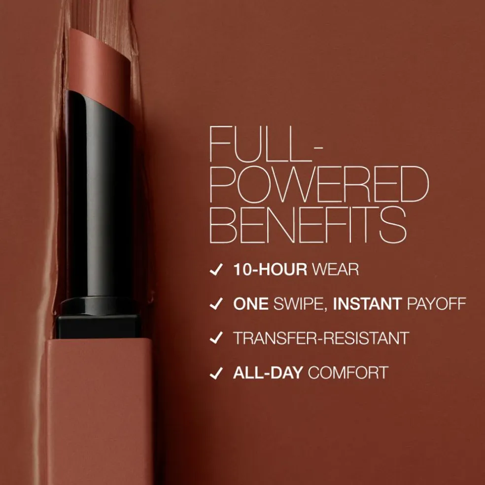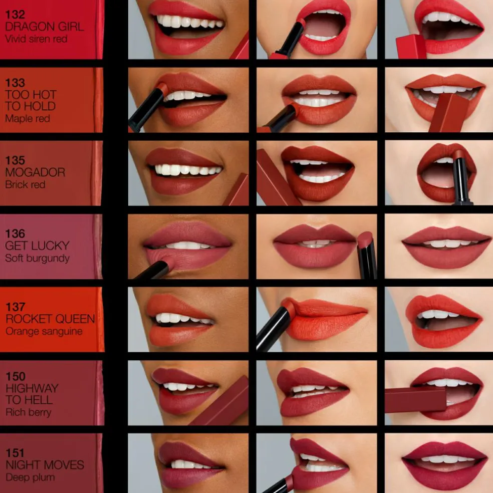 Leg med en høj-intensiv mat følelse. NARS Powermatte Lipstick er en læbestift, der med blot én påføring giver en jævn og mat finish, der varer i 10 timer. Læbestiften indeholder Power Pigment Complex, en dynamisk blanding af rene pigmenter og farvelåsende ingredienser, som mætter læberne med en dyb farve, der føles komfortabel hele dagen.