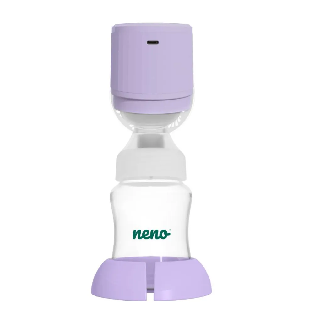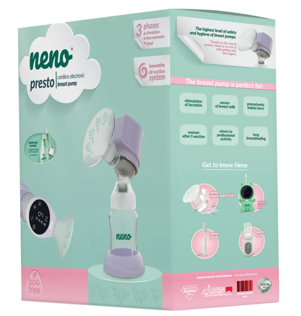 Neno Presto er nem at rengøre og sterilisere med kogende vand eller damprensning. Den leveres med en flaske med sut, 24 mm brysttragt, flaskeholder og opbevaringstaske til modermælk.