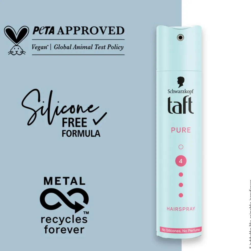 Den innovative Taft Pure-formel indeholder ikke silikone og parfume, er dermatologisk testet og giver et stærkt langvarigt hold uden at klæbe, samtidig med at den er nem at børste ud. Denne Taft-hårspray uden parfume til alle hårtyper hjælper med at beskytte mod en tør hårfornemmelse.