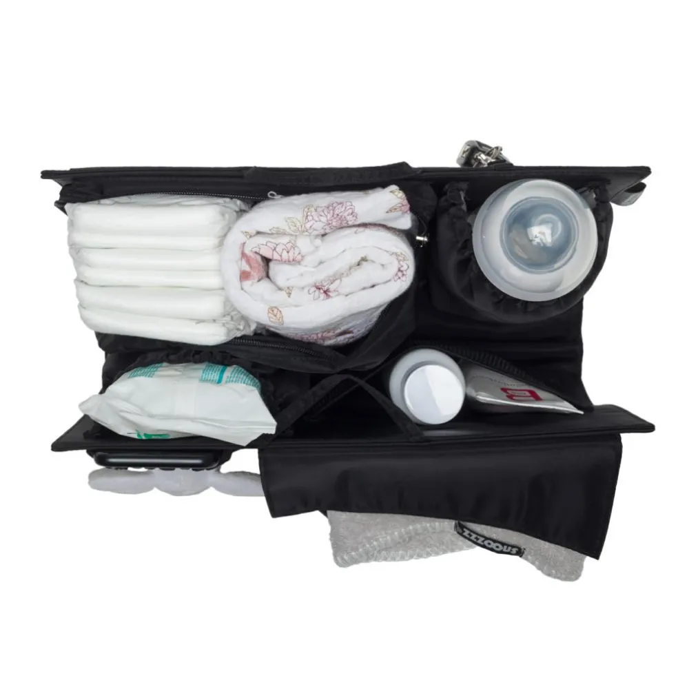 Til pusletasken medfølger en aftagelig organizer, der er super praktisk med masser af opbevaringsmuligheder, herunder termolomme, to rum med lynlås, diverse lommer og et pusleunderlag. Matchende taskekroge til barnevognen medfølger.