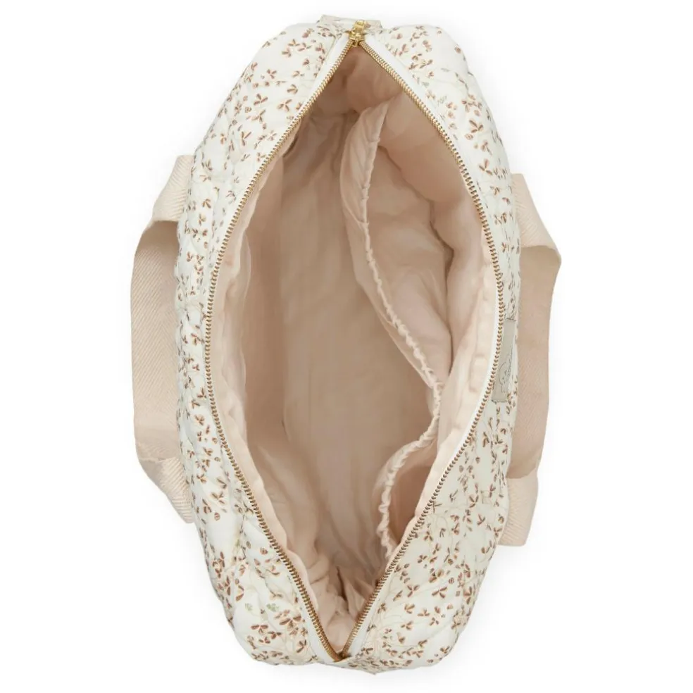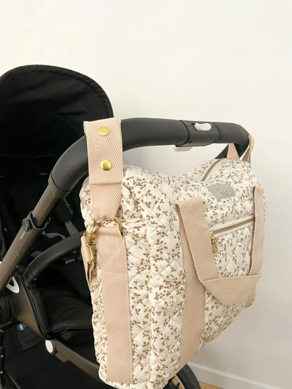 Der medfølger to små stropper, så du kan fastgøre Pusletasken til styret på barnevognen eller klapvognen. Pusletaske i hvide og brune nuancer.