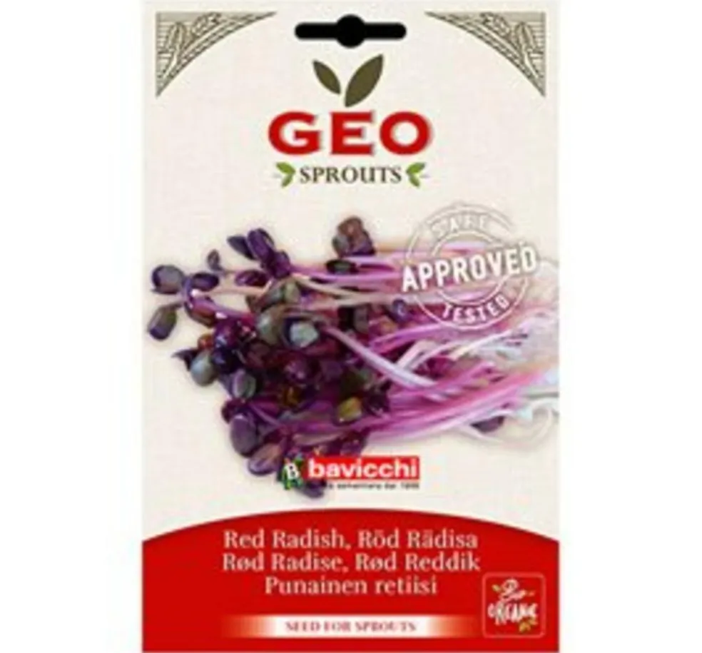 Røde radisefrø til spiring har den genkendelige smag af radise og pynter ethvert bord med deres flotte lilla farve. De kan bruges i bl.a. salater, sandwich, brød, te, supper og smoothies. De er desuden velegnede som topping.