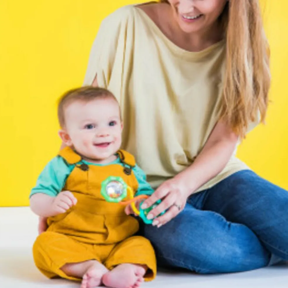 Med muntre gule og blå detaljer og et sjovt håndtag, der kan drejes, er denne rangle bare så sød og lige så stærk som din voksende baby.
