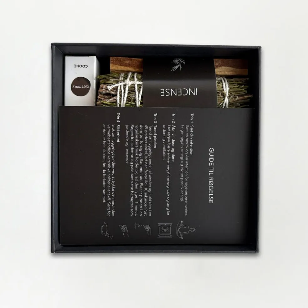 Brug rosmarin, Palo Santo eller hvid salvie til røgelsesritualer, og følg guiden i pakken.