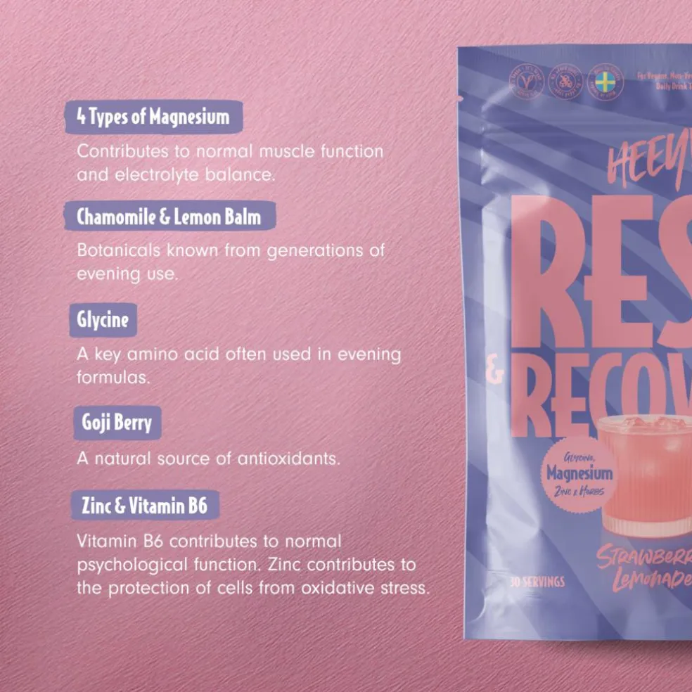 Heey! Rest & Recover kombinerer fire letoptagelige former for magnesium – citrat, taurat, bisglycinat og malat – med vitamin B6, zink, glycin og ekstrakter fra kamille, citronmelisse og gojibær.