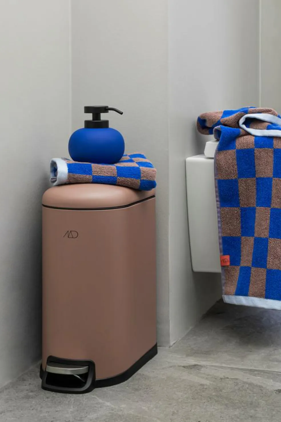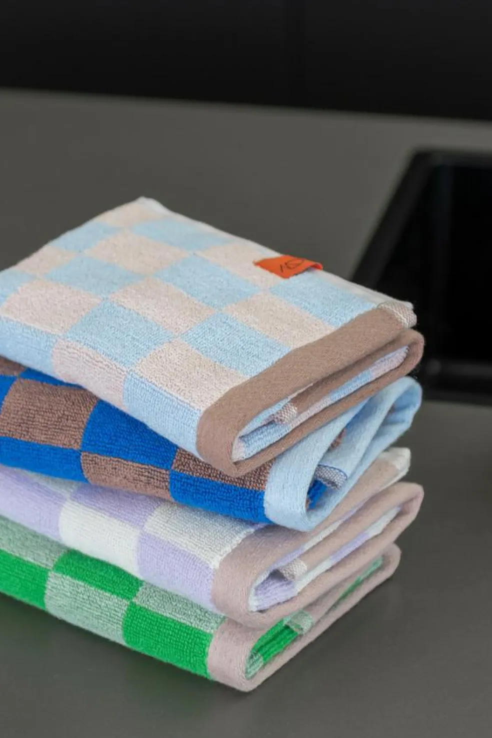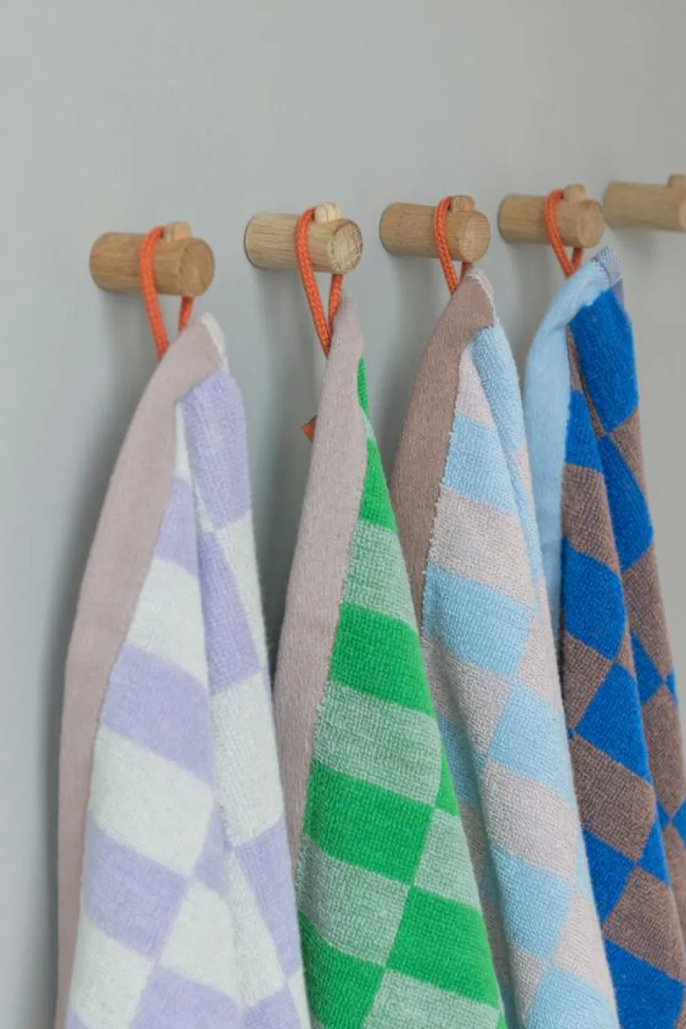 Når håndklæderne ikke er i brug, ser de fantastiske ud på et stativ eller i en åben kurv. Mix og match RETRO håndklæderne med farvestrålende badtilbehør fra Mette Ditmer.