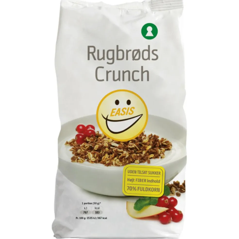 EASIS Rugbrøds Crunch er en knasende sprød müsli baseret på havre og rug. Den er uden tilsat sukker samt sødemidler og indeholder hele 70% fuldkorn. Nøglehulsmærket sikrer dig, at produktet lever op til