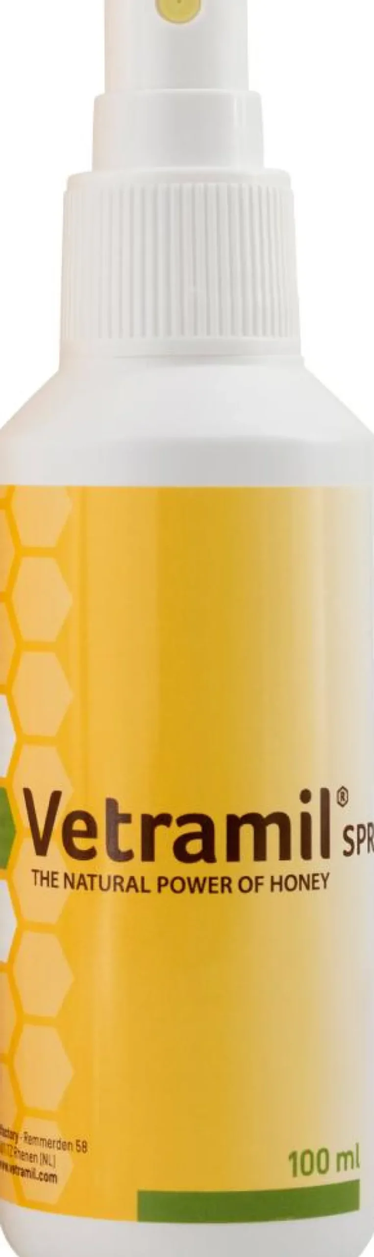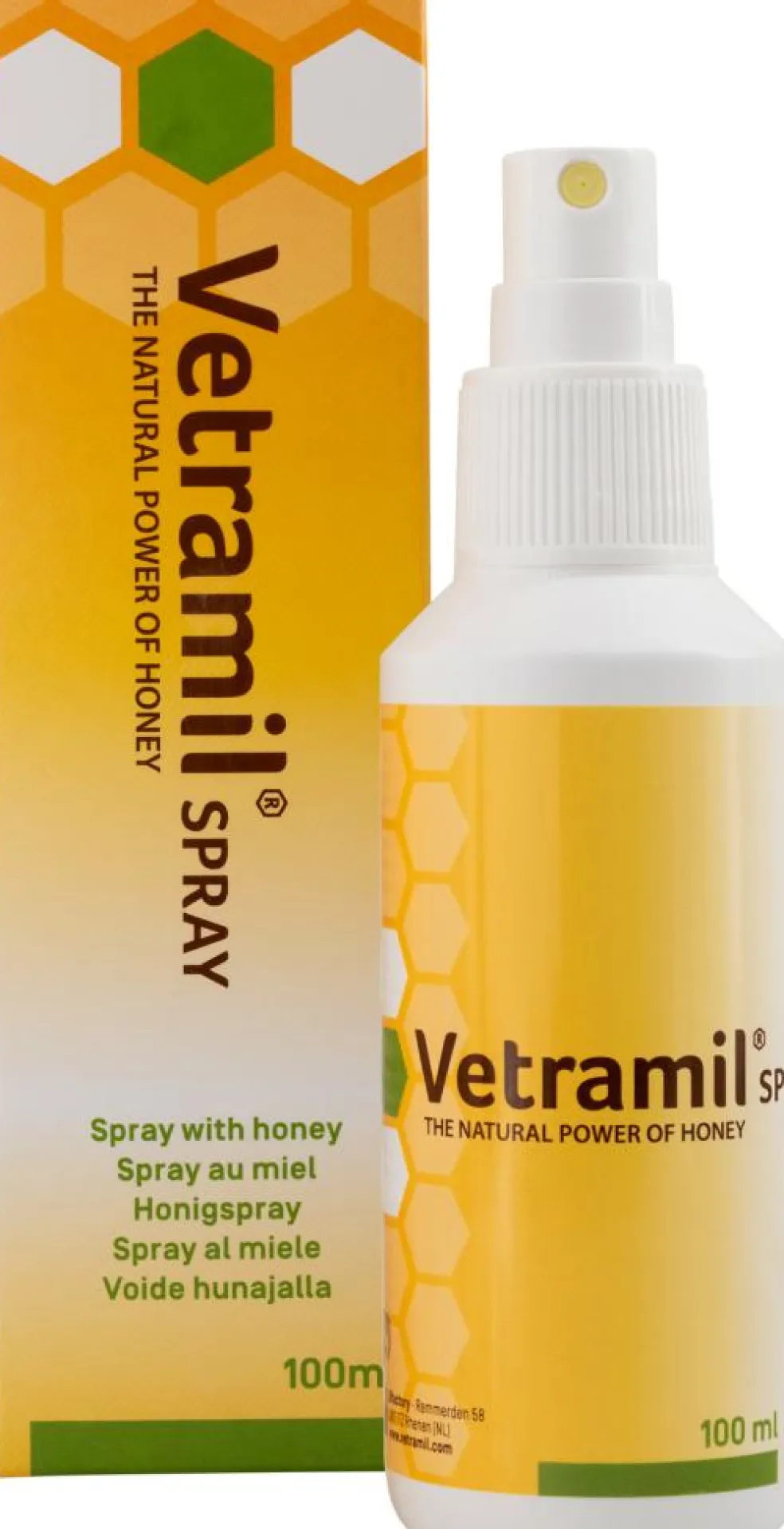 Vetramil sårspray til sårbehandling hos dyr er baseret på en standardiseret, medicinsk honning tilsat essentielle olier.