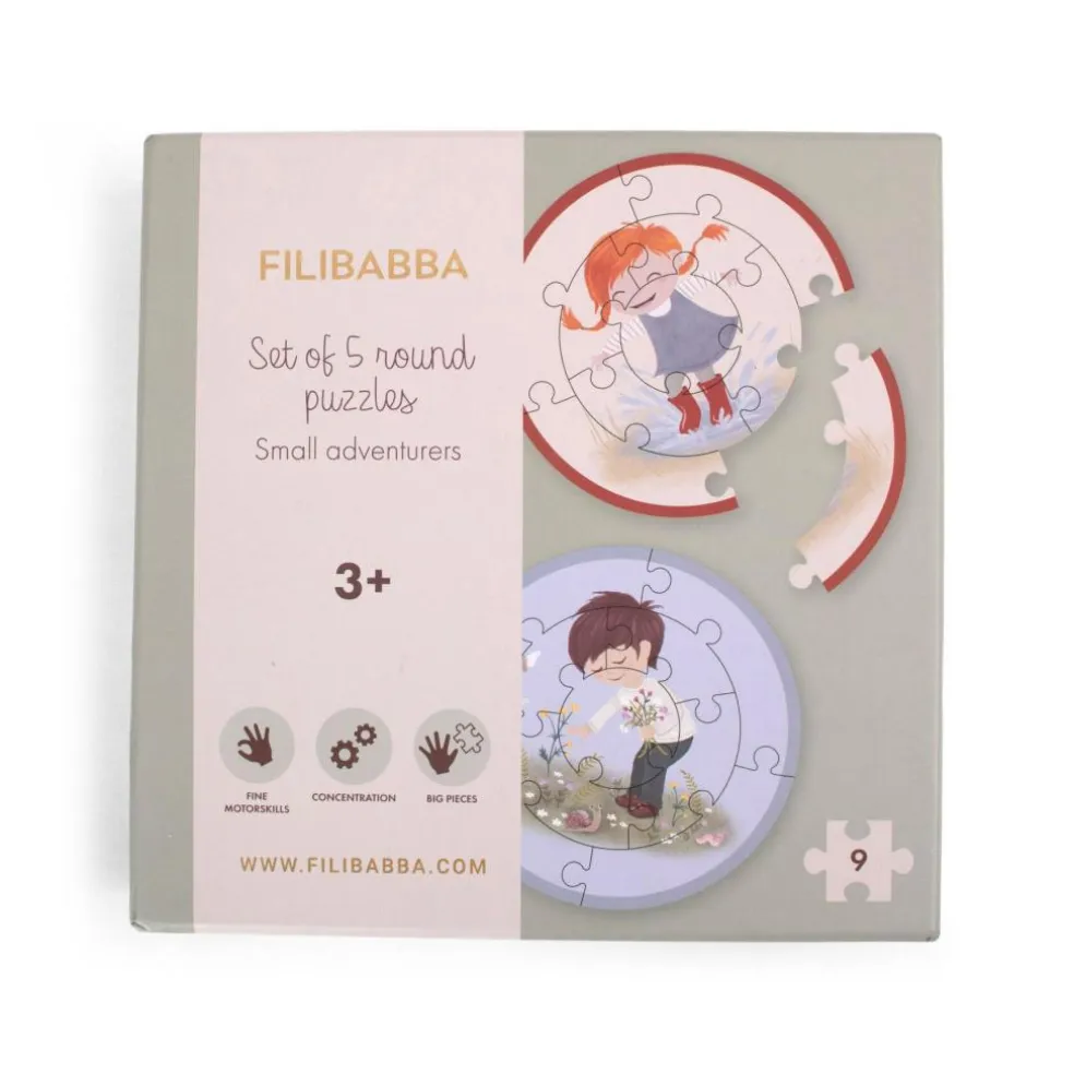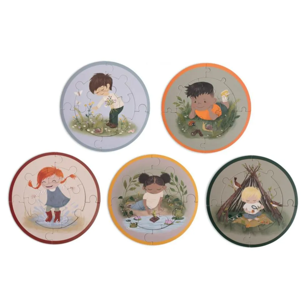 – Sæt med 5 runde puslespil, hvert med 9 brikker.