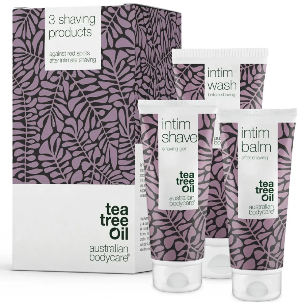 Pakken til intimbarbering indeholder Intim Wash, Intim Shave og Intim Balm med Tea Tree Oil, der effektivt modvirker bakterier og sikrer en pæn intim barbering fri for røde knopper, skægpest og indgroede hår.