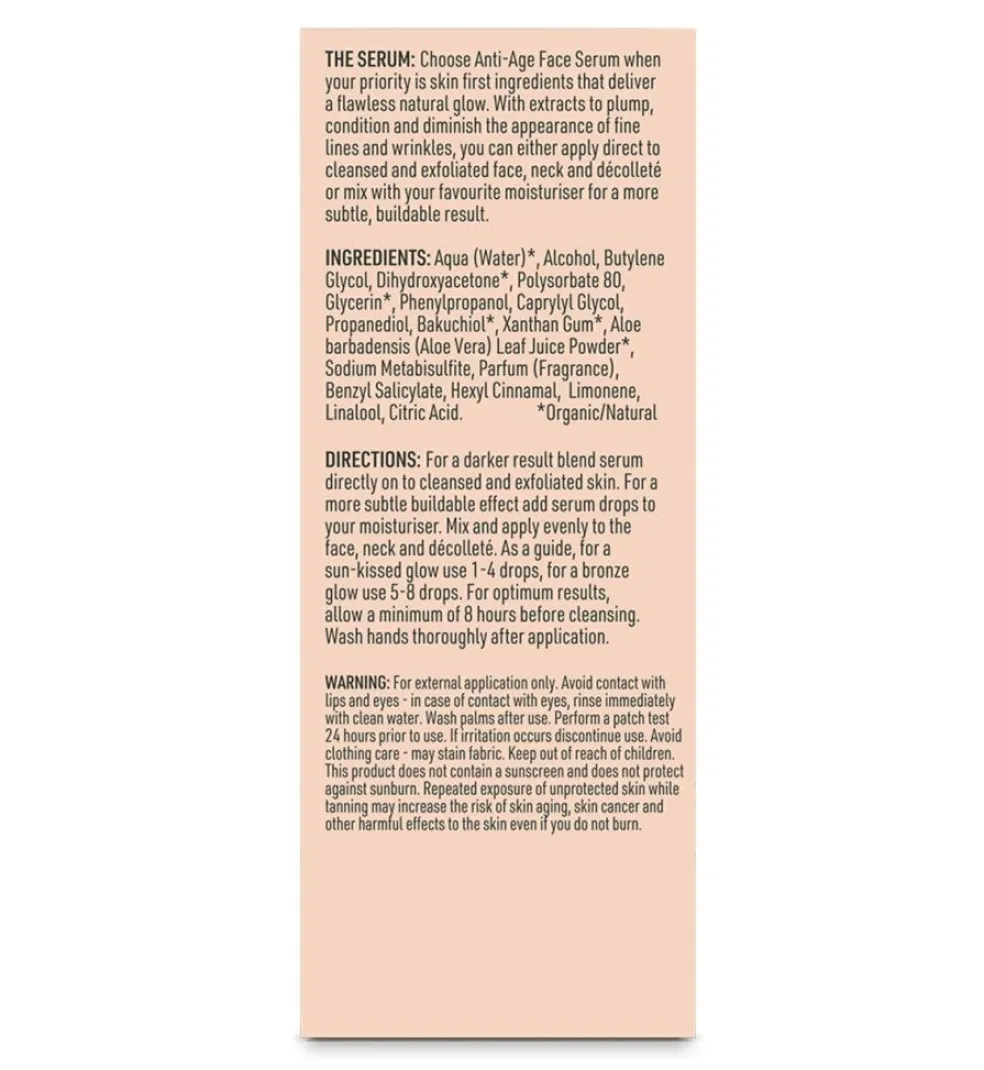 Designet til at arbejde med din eksisterende hudplejerutine. Den dybt fugtgivende formel, beriget med bakuchiol(naturligt A vitamin), bekæmper aldringstegn, mens den gradvist opbygger en naturlig solbrun farve ved hver påføring.