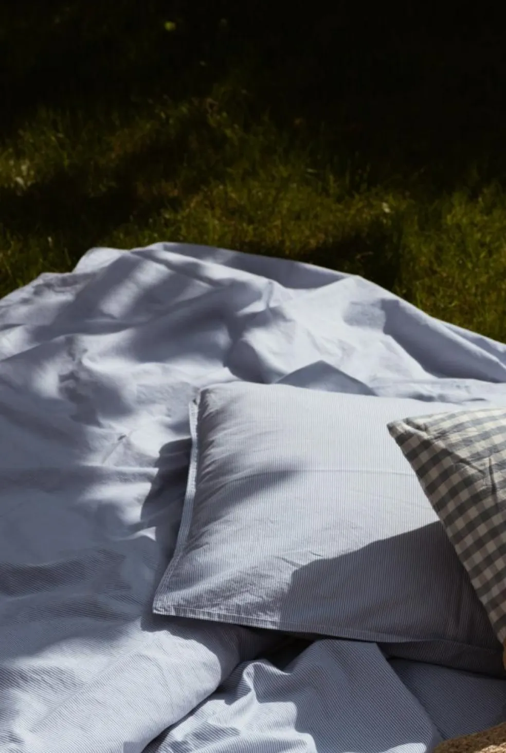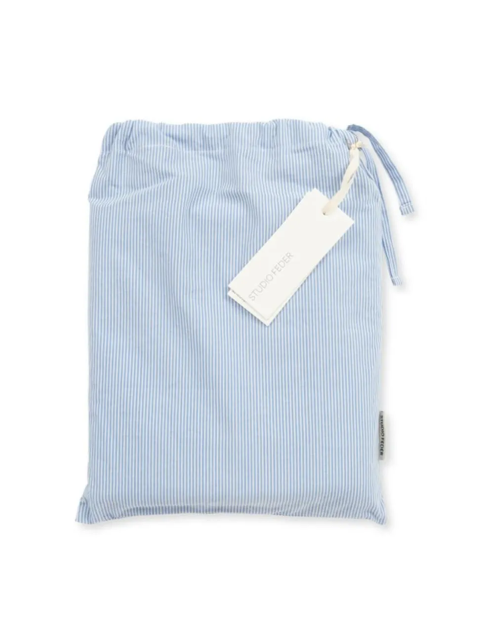 Sengetøjet leveres i en matchende stofpose, der lukkes foroven med bindebånd.
