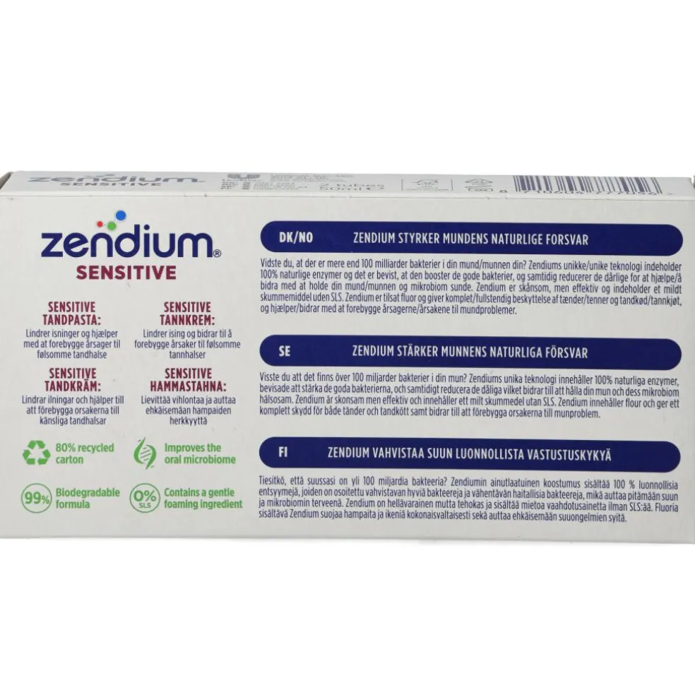 Zendium Sensitive er en tandpasta specielt udviklet til at beskyttelse blottede tandhalse og dermed reducere isninger i tænderne. Zendium Sensitive indeholder ekstra beskyttende og milde ingredienser.