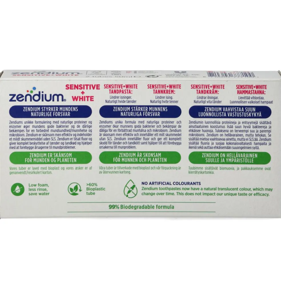 Zendium Sensitive Whitener gør nænsomt tænderne hvidere. Beskytter mod isninger i tænderne.