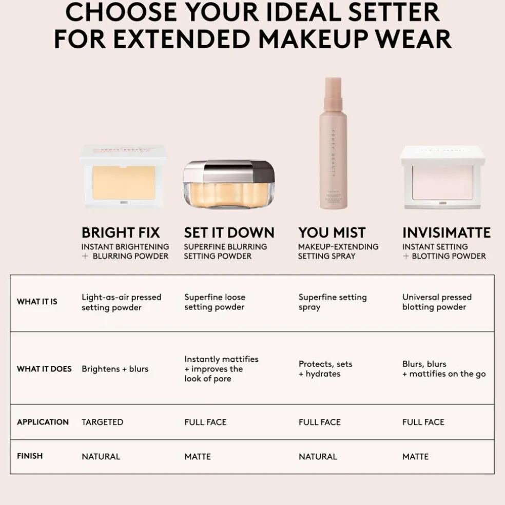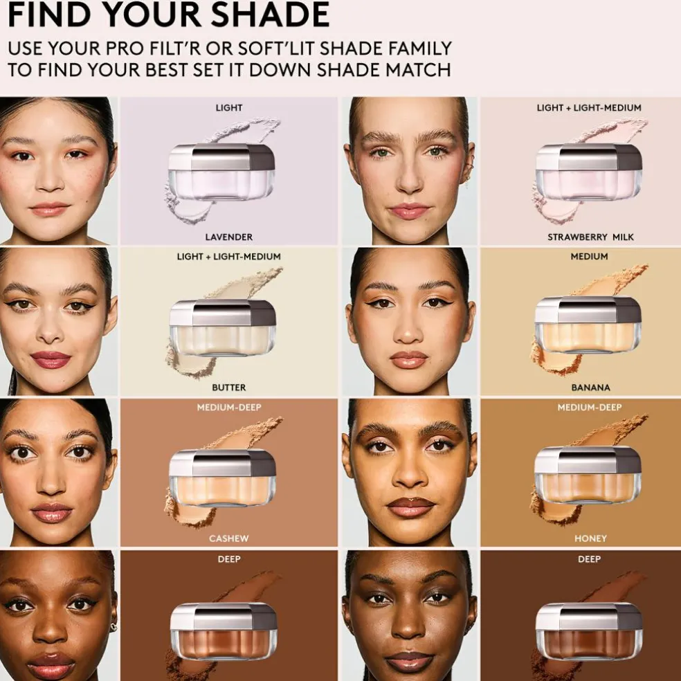 Påfør et ultralet setting-pudder, der forlænger makeupens holdbarhed, beskytter mod sved og fugt og matter glans, mens det udjævner porernes synlighed.