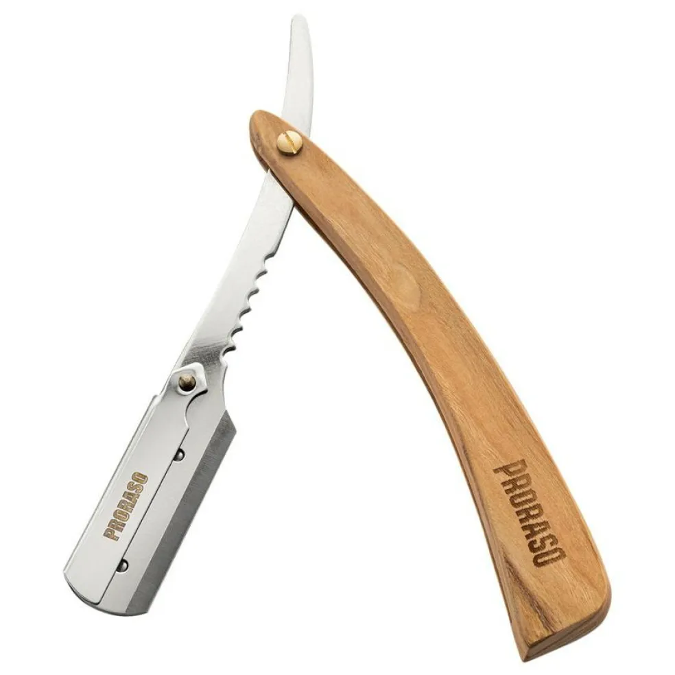 Klingen på denne shavette er lavet i holdbart, rustfrit stål, mens skæftet er lavet i træ og har indgraveret Prorasos logo.
