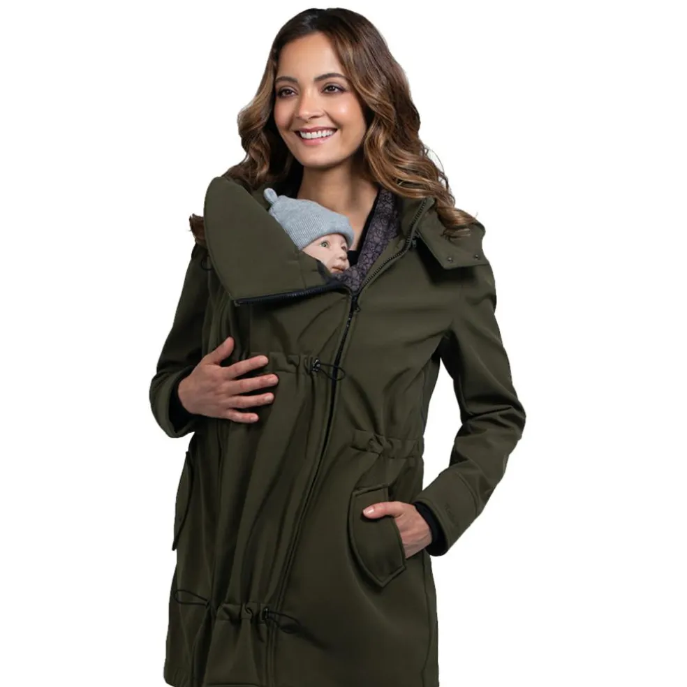 En 4-i-1 jakke, der passer over enhver bæresele eller vikle, uanset om du bærer på front eller ryg, takket være det ekstra panel. Uden panelet kan den bruges som en almindelig jakke så længe du vil.