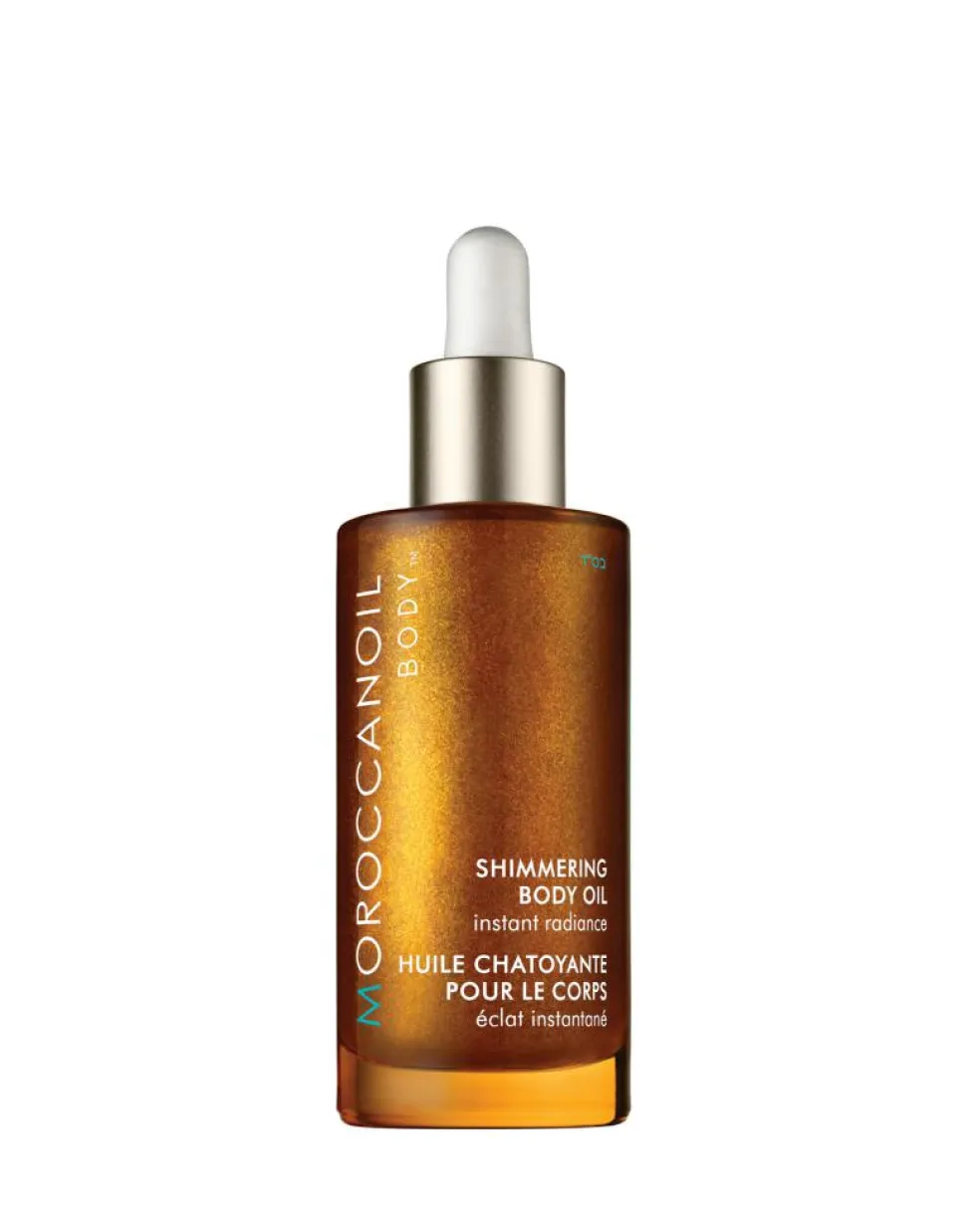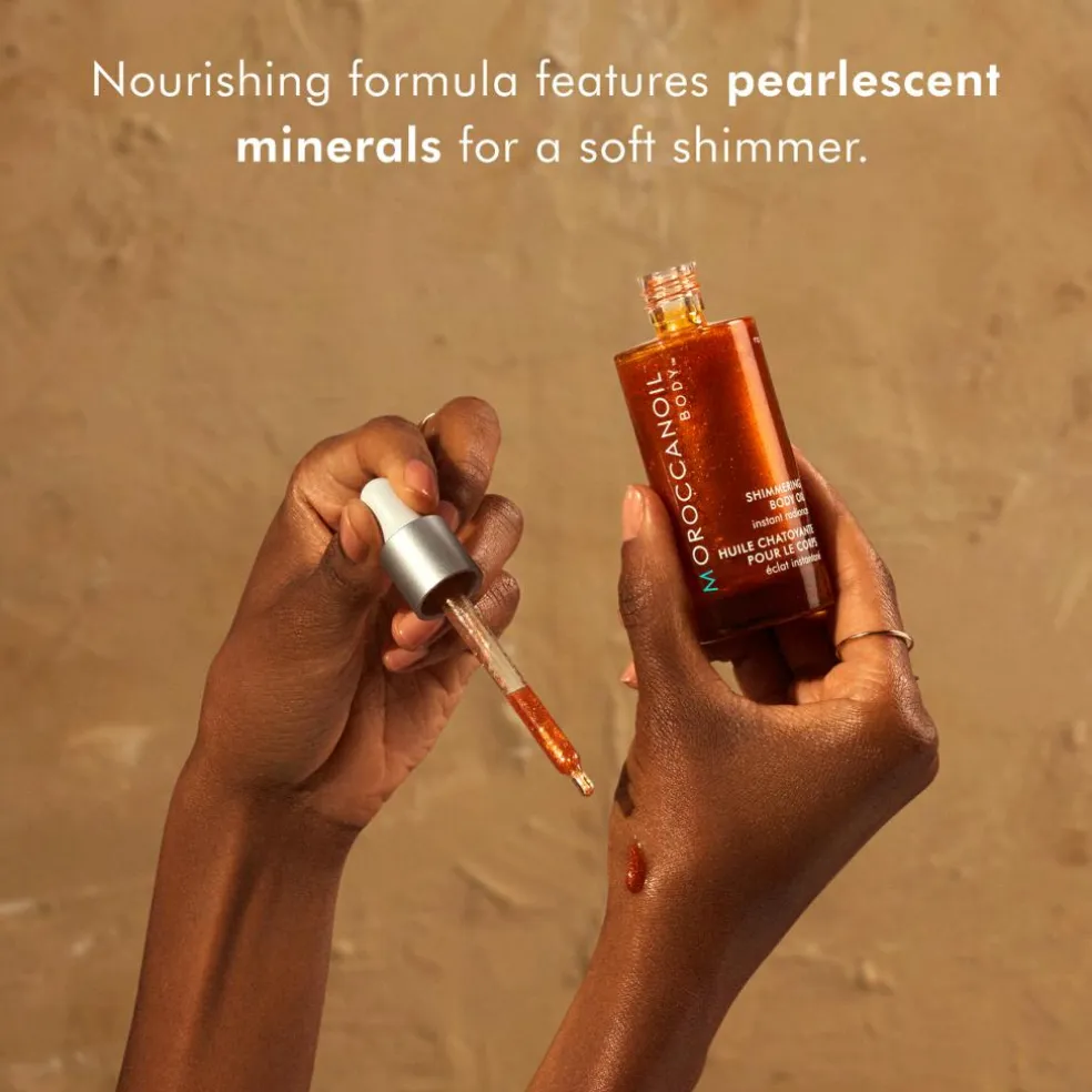 Moroccanoil Shimmering body Oil indeholder antioxidantrig arganolie, der med sine nærende egenskaber tilfører fugt og pleje, samt sesamolie, som blødgører, genopbygger og opfrisker huden. Ydermere er olien beriget med perlemors mineraler, som tilfører huden en strålende glød.