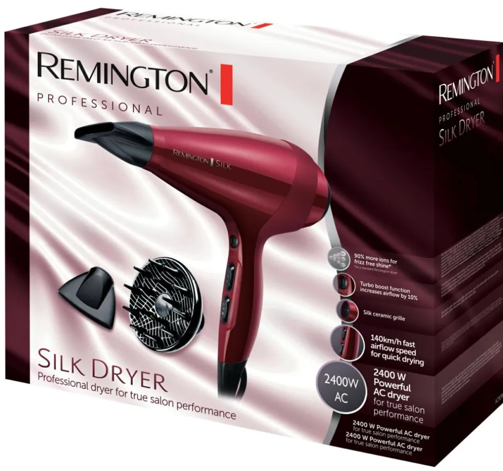 Denne højkvalitets, professionelle hårtørrer leverer hurtig, effektiv tørring med 2400W motor, en lufthastighed på 140 kilometer i timen, ion-generator og silke keramisk gitter, der skaber silkebløde resultater hver gang du tørrer dit hår. Ægte Salon resultat: Med 6 varme/hastighedsindstillinger, turbo boost funktion for 10% ekstra lufthastighed og cool shot, er det nu muligt at give dig selv den ultimative hårtørring, der efterlader dit hår blødt og skinnende. Der medfølger diffuser og koncentrator. 3m ledning i salonlængde. Der er 3 års garanti. Brugsanvisning kan findes her http://dk.remington-europe.com/women/haircare/dryers/silk-hair-dryer-ac9096.html *ift. standard Remington hårtørrer