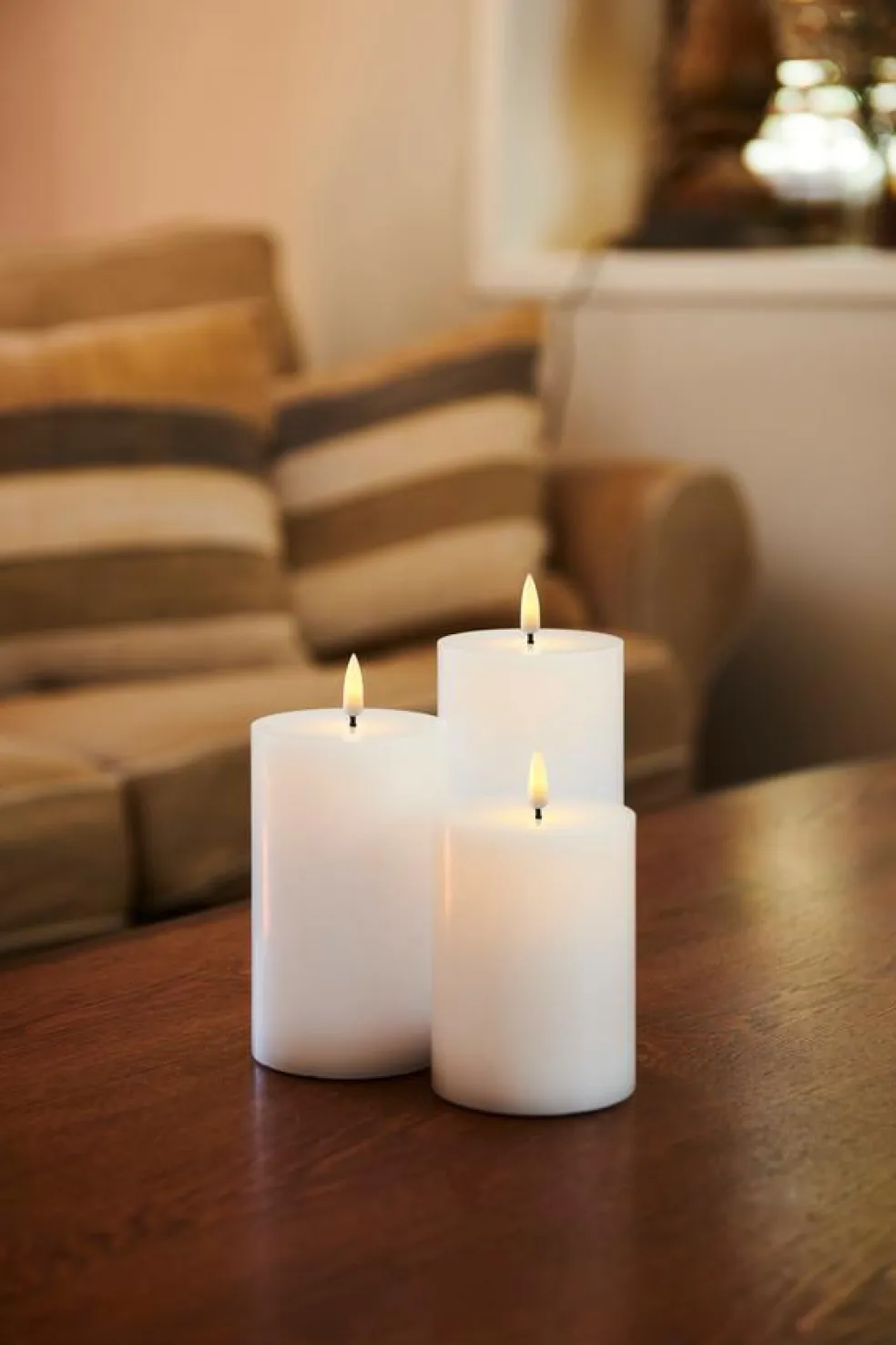 Sille vokslys er genopladelige lys med et moderne look. Vokslyset er fin og rund og toppen er helt lige. Det lille vokslys giver et meget flot og moderne kick til hjemmet og passer helt perfekt på spisebordet. Sille vokslys Genopladelig 3 stk sæt, Ø7,5xH10/12,5/15cm, Hvid.