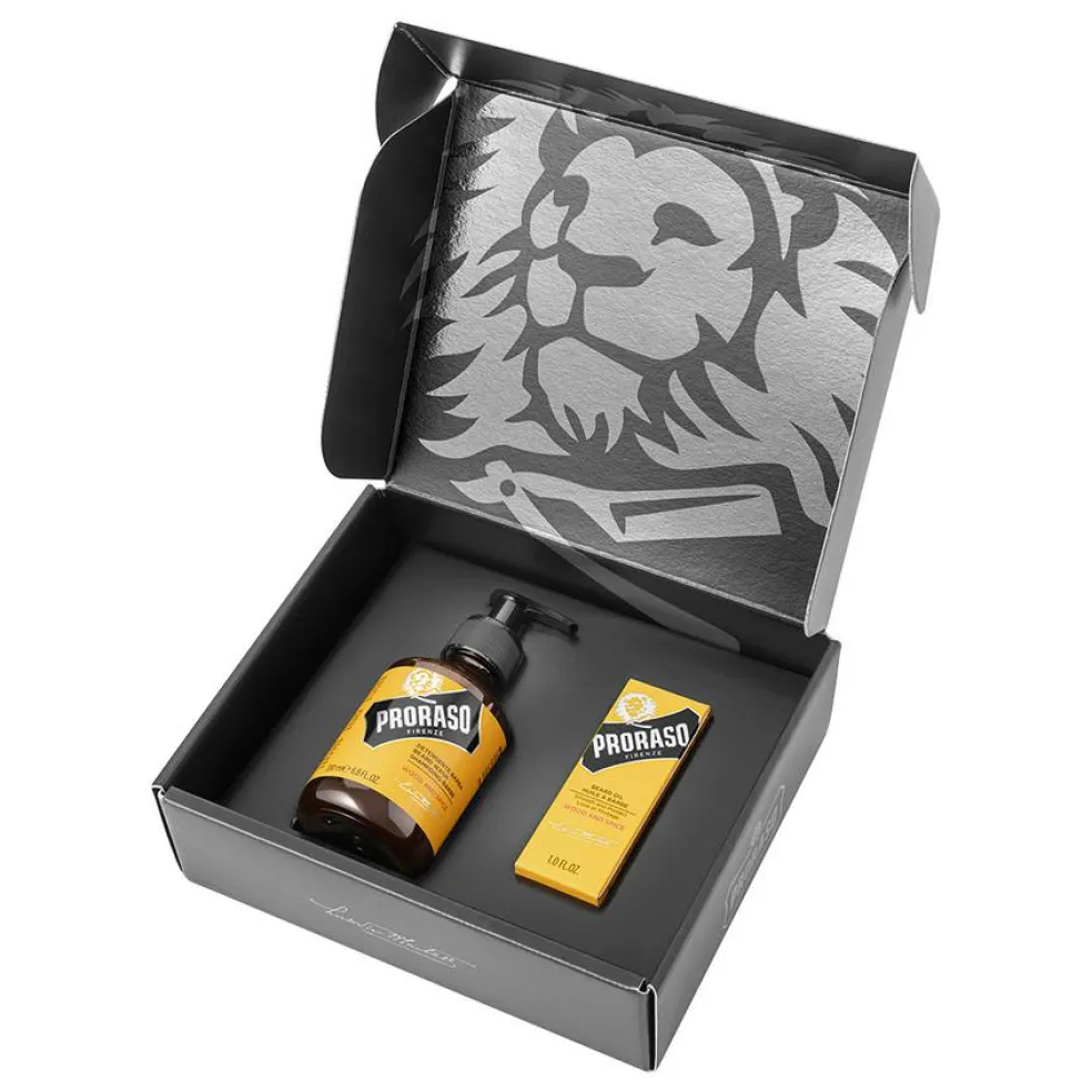 Gaveæsken indeholder rensende Skægshampoo og plejende Skægolie i serien Wood & Spice, som har en skøn duft af cedertræ og krydrede noter.