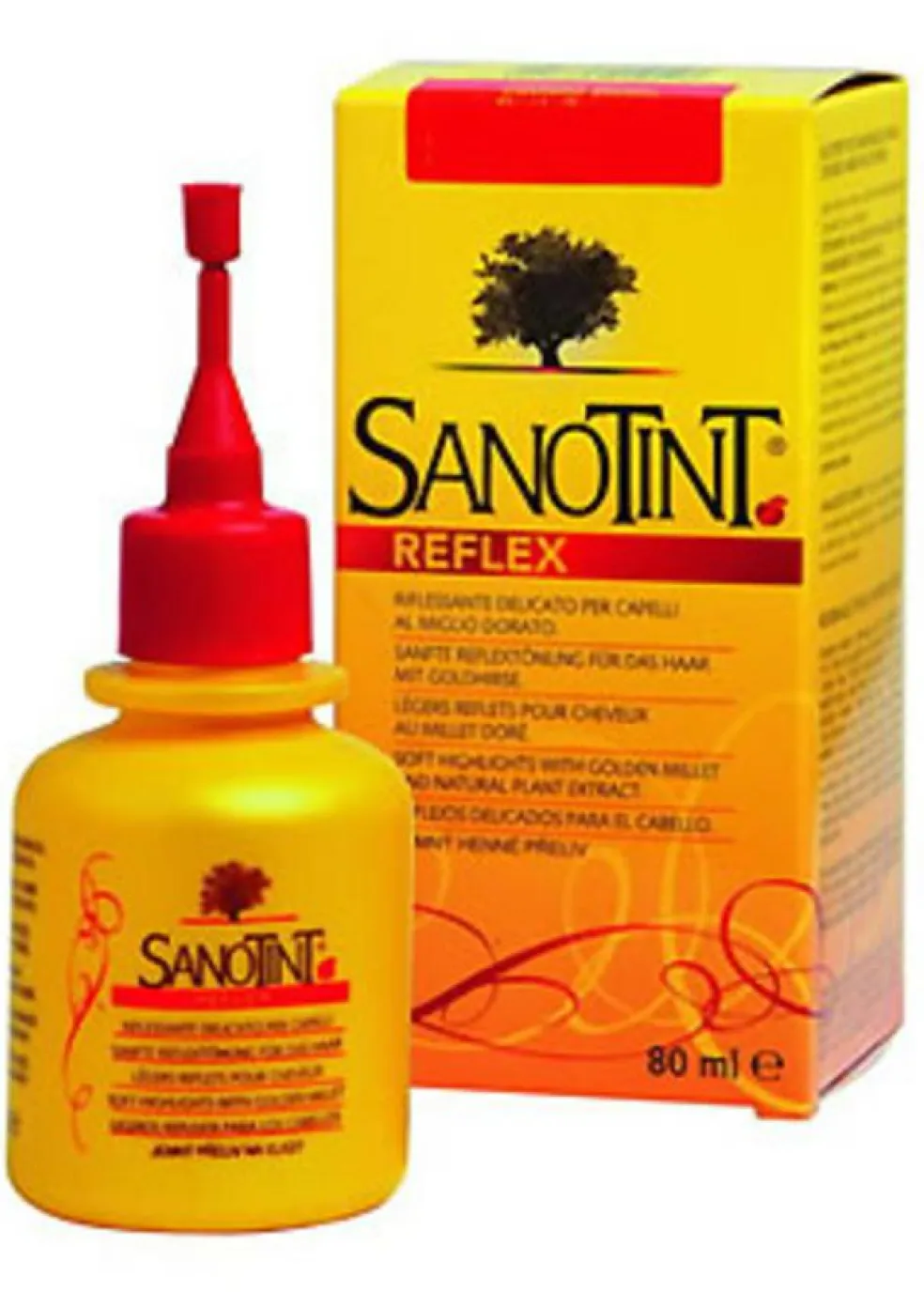 Sanotint Reflex er et naturligt produkt, der indeholder ekstrakter af kamille, olivenblad og gylden hirse, der garanterer lyse og strålende highlights, der skaber forskellige nuancer fra mørk sort til varm dyb rød.