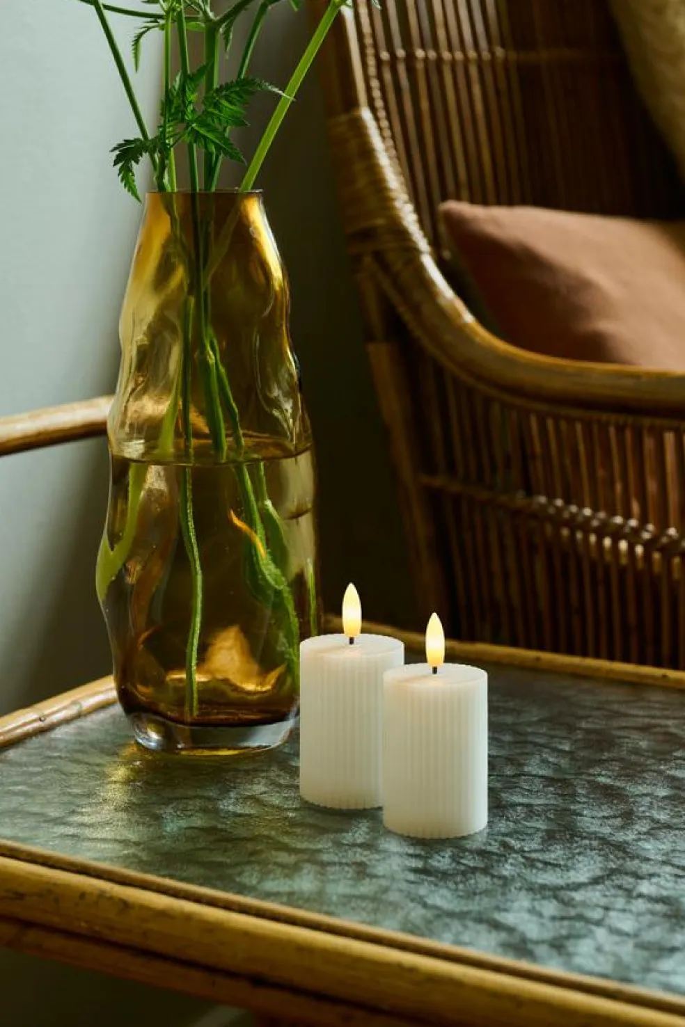 Stearinlyset er lavet af rigtig stearin og tåler maks. 30 grader, pas på med direkte sollys. Kun til indendørs brug.