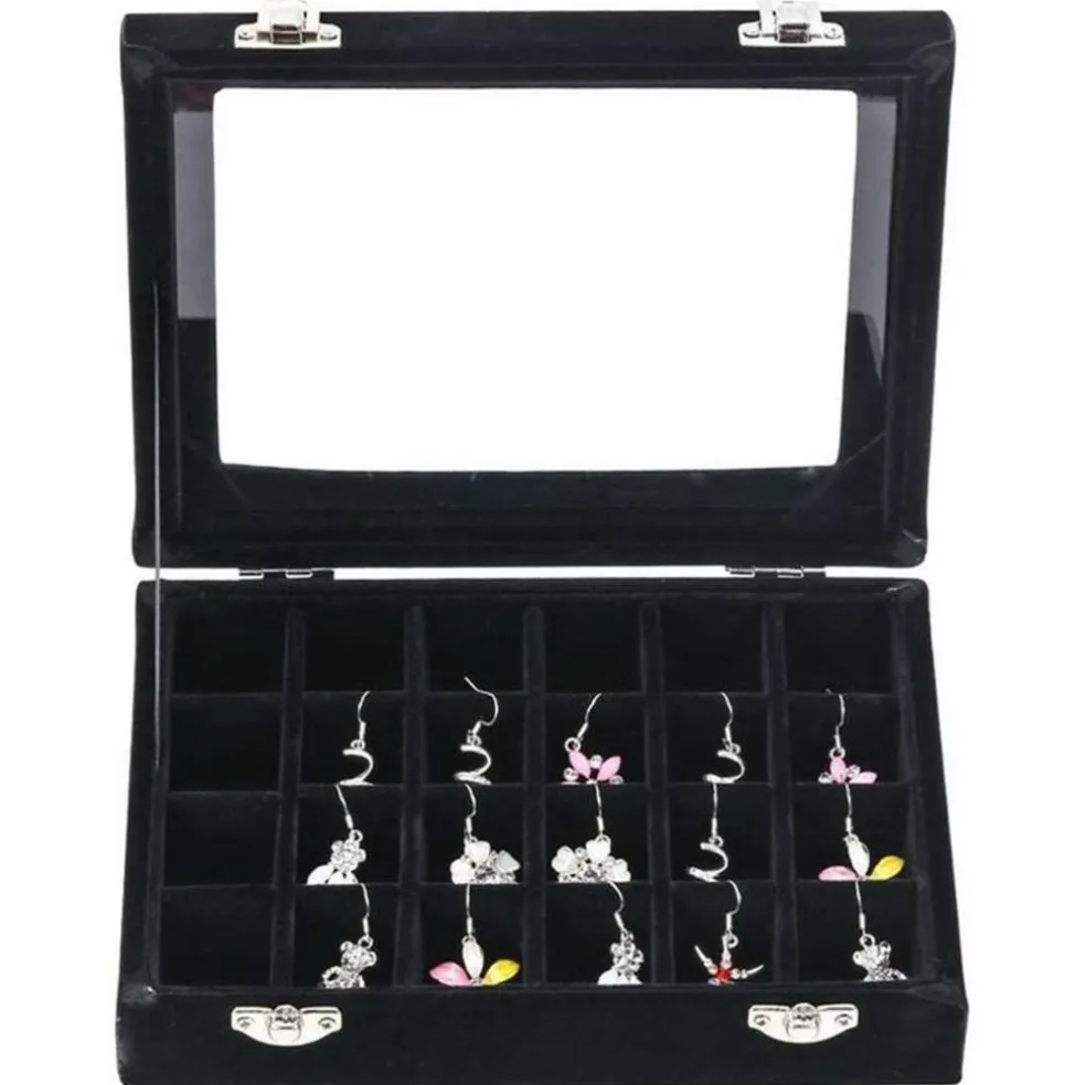 Fint smykkeskrin fra UNIQ i sort velour som indeholder 24 rum. I skrinet er der glasrude, så du altid kan se dine smykker. Den kan bruges til at opbevare dine ringe, halskæder, øreringe og meget mere.