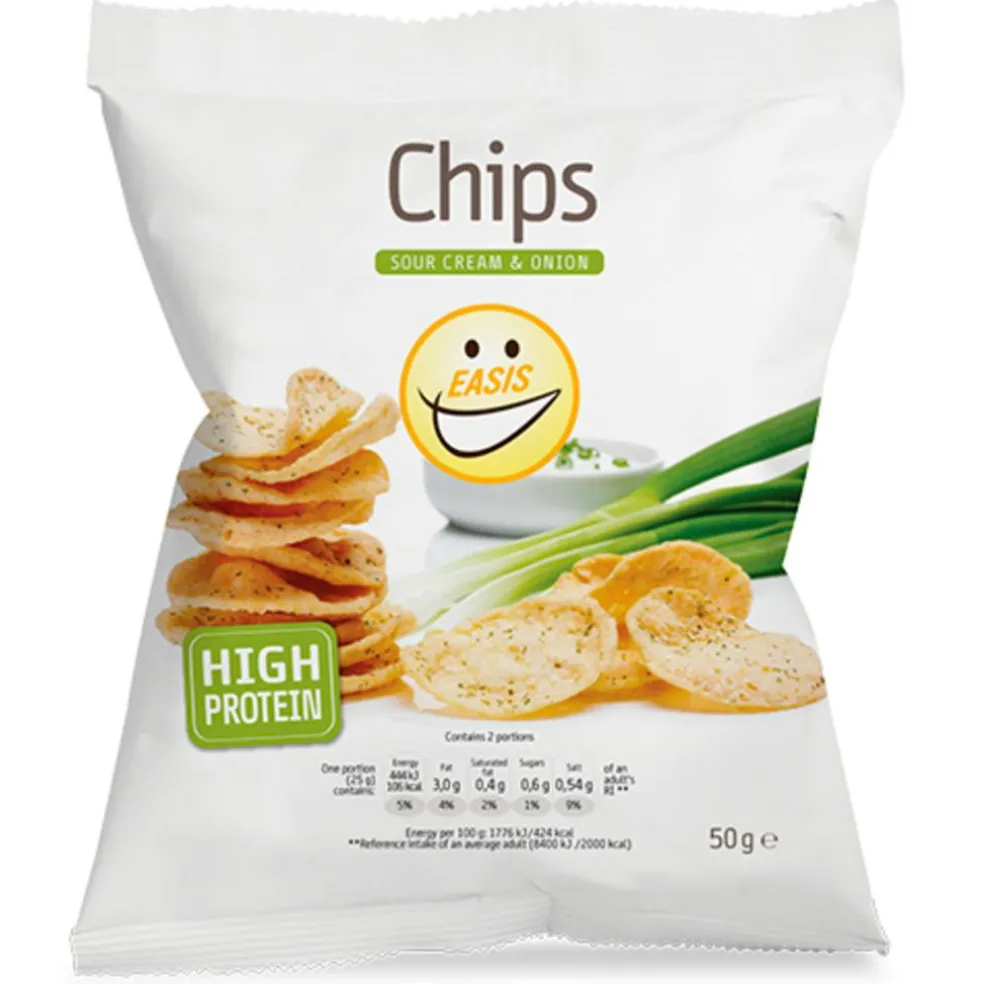 Krydrede kartoffelchips. EASIS Chips med Sour Cream & Onion er til dig, der er vild med sprøde, velsmagende chips. EASIS Chips har et højt fiber- og proteinindhold. En pose (50 g) indeholder 212 kcal.