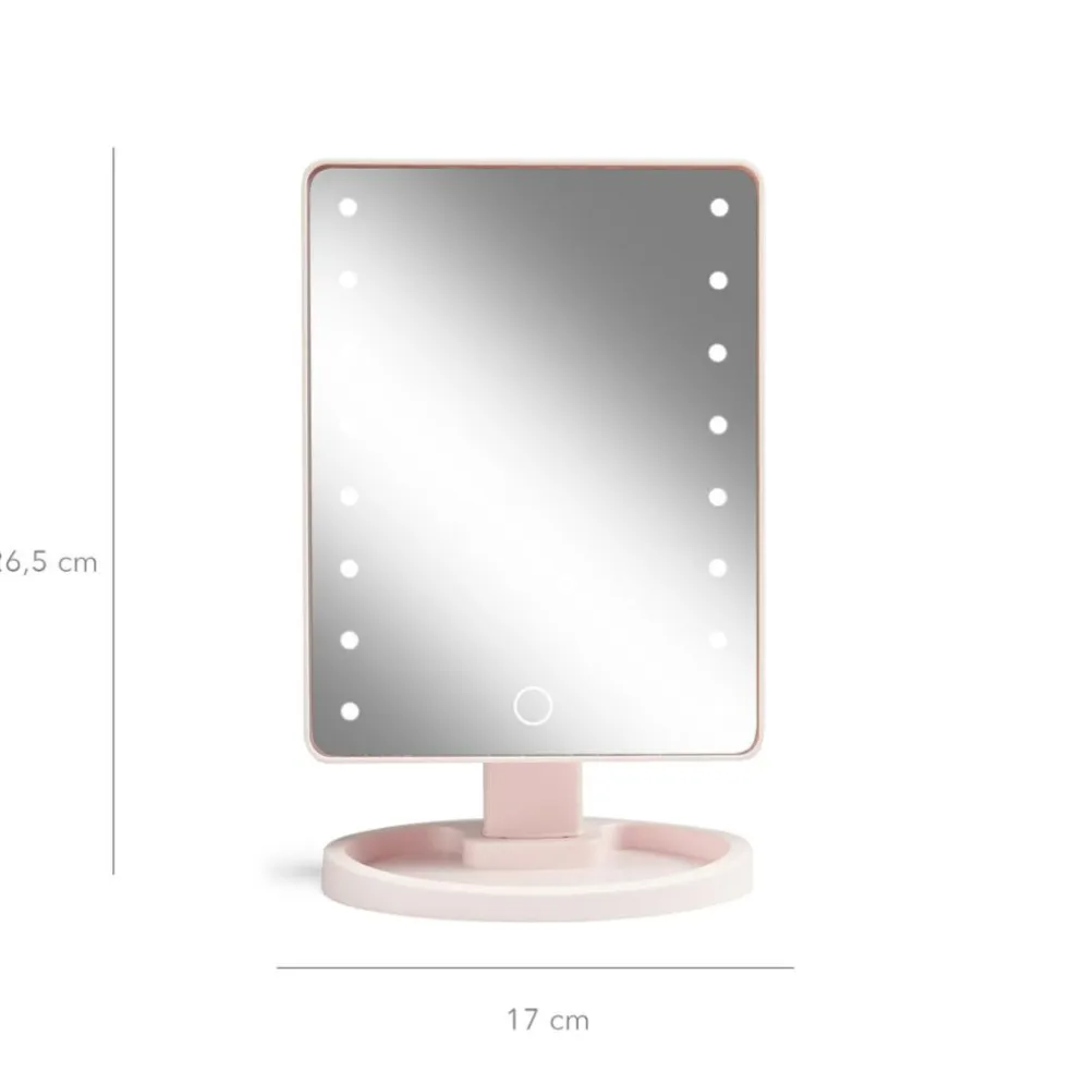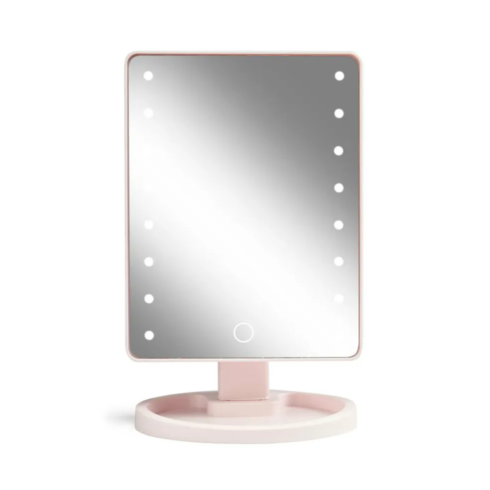 Bordspejl med 16 kraftige LED lys og touch-funktion. Spejlet kan tiltes for at få den helt rigtige vinkel når der skal lægges makeup. Med bakke-fod til bl.a. mindre genstande så som hårnåle. Bruger 4xAA batterier, og kan få strøm fra det medfølgende USB-c kabel.