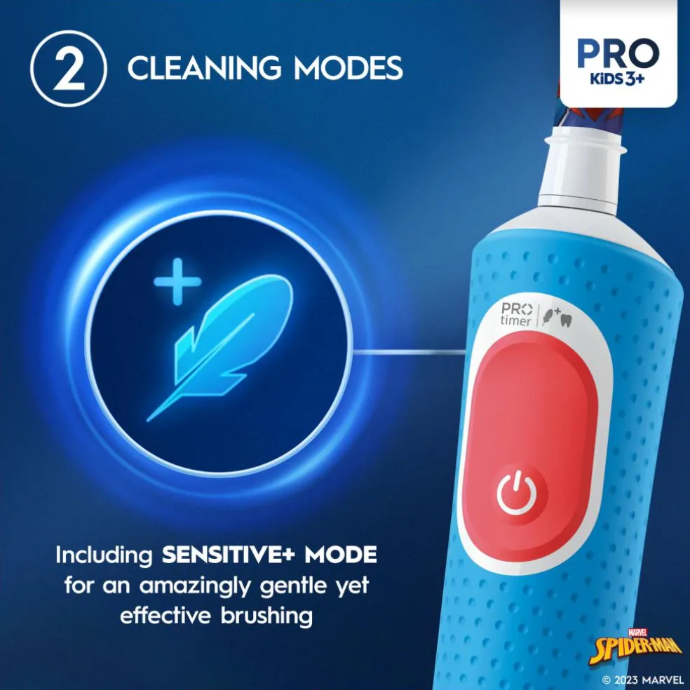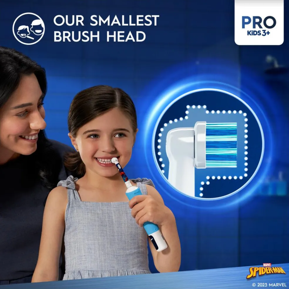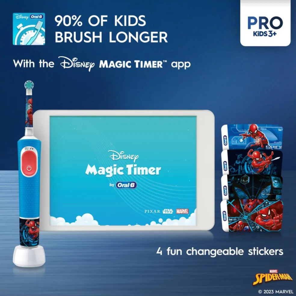 Der medfølger fire klistermærker med Marvel Spiderman motiver for at gøre eltandbørsten mere personlig.