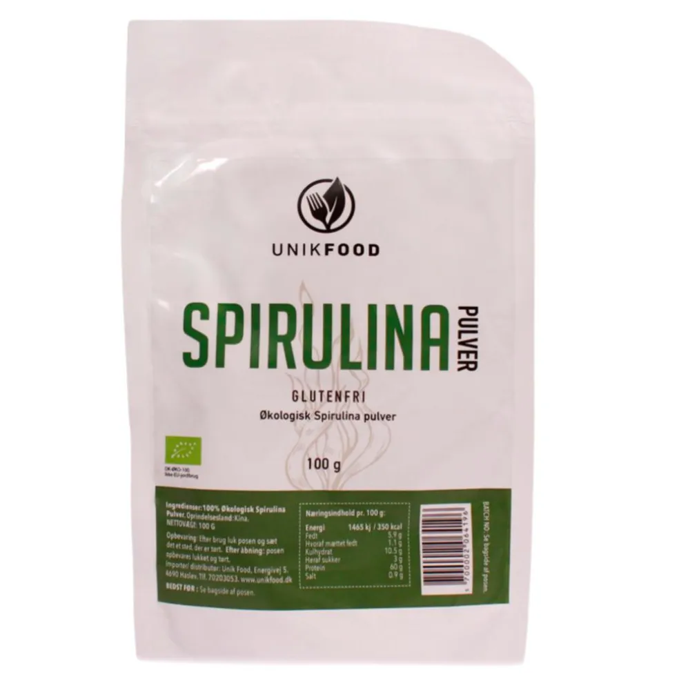 Økologisk spirulinapulver fra Unik Food, der kan tilsættes til smoothies, juice og meget andet. Spirulina er en grøn ferskvandsalge med det latinske navn Arthrospira platensis. Spirulina er kilde til protein.